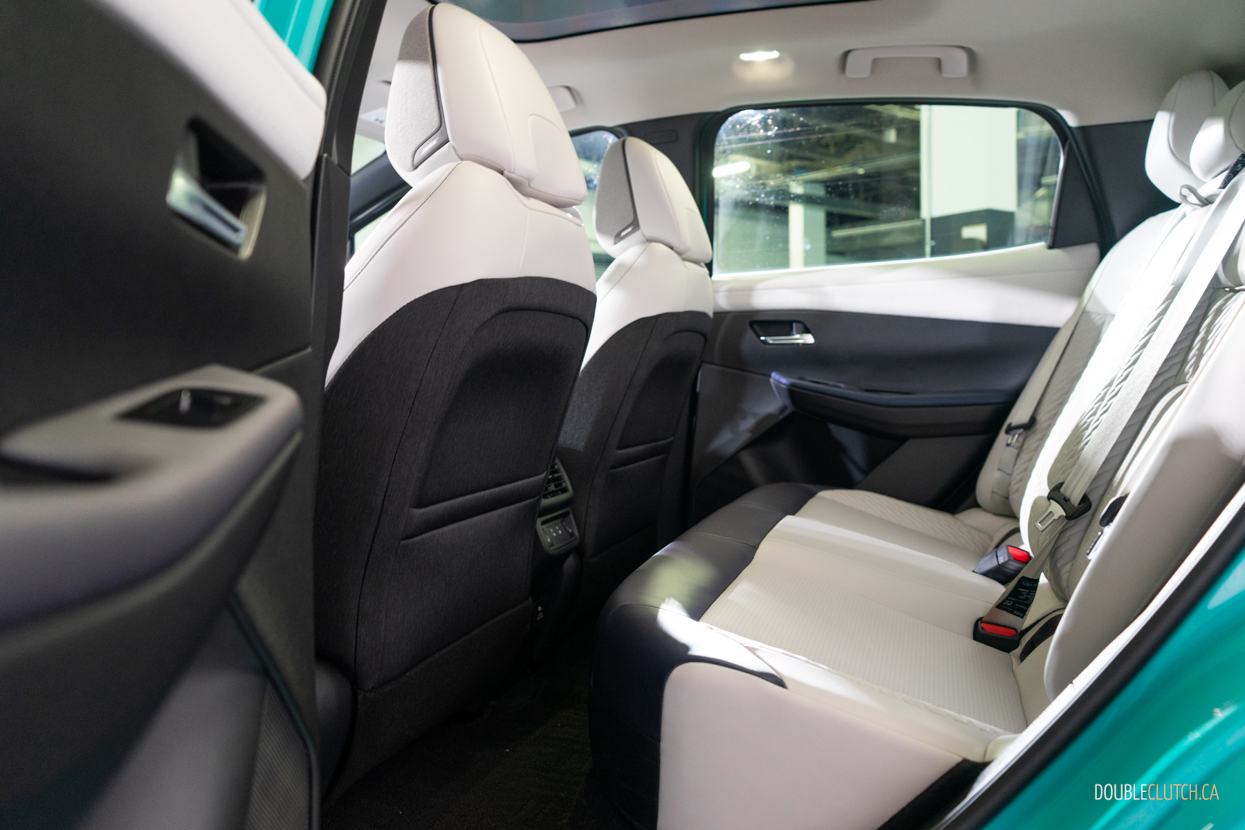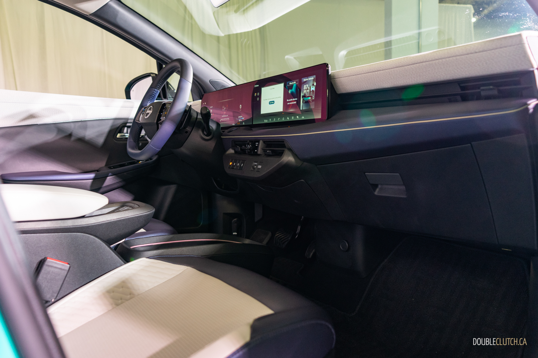Inside, the 2026 Leaf continues to borrow heavily from other Nissans. The dash design draws heavy inspiration from the Kicks, though the floating centre console is unique to the Leaf, and the touch panel-based climate controls sit directly below the infotainment screen. Materials feel so-so at best — there’s a lot of hard-touch surfaces if you care about that — but the fabric trim and colour-keyed crash pad look and feel nice, and we imagine a lighter interior colour would lend a sense of airiness. There’s plenty of headroom, legroom, and shoulder room up front and out back even for six-footers, but sitting out back, you might find there isn’t much space for your feet under the front seats. Cargo space comes in at 566 litres with the rear seats up, and 1,572 when folded.
