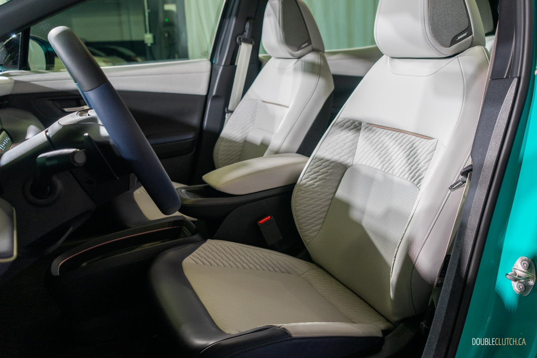 On tech, twin 12.3-inch displays under one panel come standard, while upper-spec trims — like the Platinum featured here — swap them out for 14.3-inch screens. The upsized setup runs Google’s infotainment software, though wireless Apple CarPlay and Android Auto are standard across the board. Also standard is Nissan’s full suite of active safety and driver assists, though the Leaf doesn’t get Nissan’s newest ProPilot 2.1 suite just yet. More standout features inside include an electric-dimming fixed glass roof not unlike the Porsche Taycan and VW ID. Buzz, as well as Bose’s Nissan-specific sound system with headrest speakers.