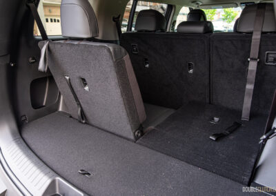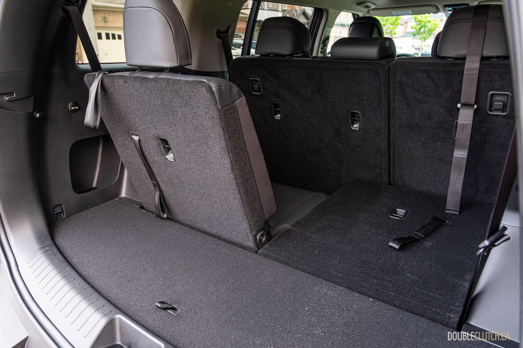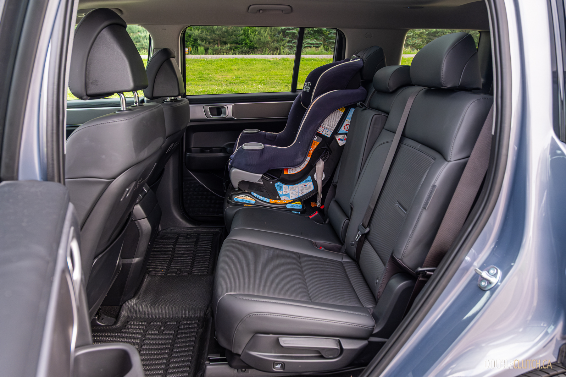 First- and second-row seating is comfortable, but it’s a sliding scale. The first row is the comfiest, follow by the second, and the third row is a distant third. The bench back there feels very flat and thin, but at least they fold completely flat into the floor, making for a rather cavernous cargo hold behind the second row. Of all the colour combinations and upholstery options Hyundai offers, our tester gets the least-exciting black leatherette seats and interior trim to match. The Calligraphy, on the other hand, can be had with Nappa leather with some downright sexy colours, like cognac or even dark green.