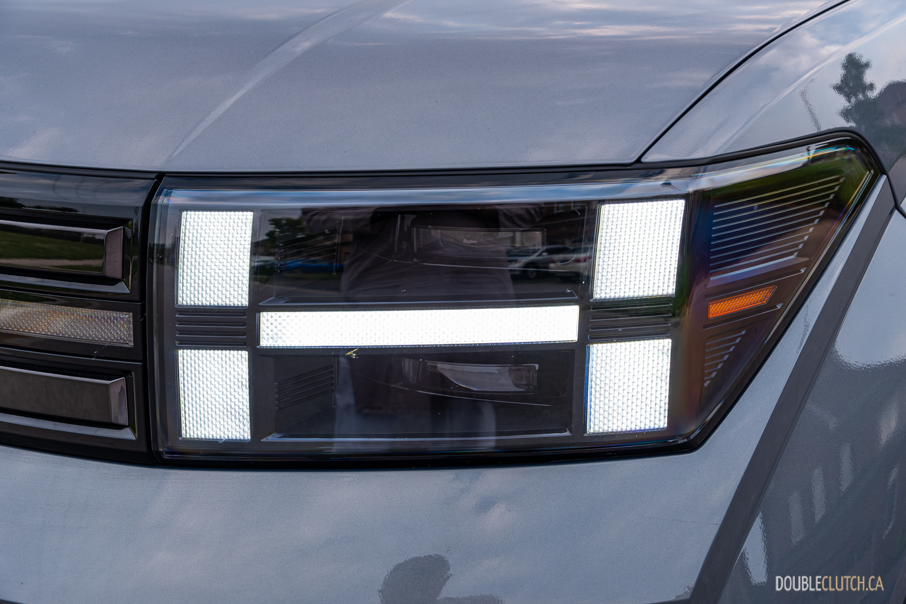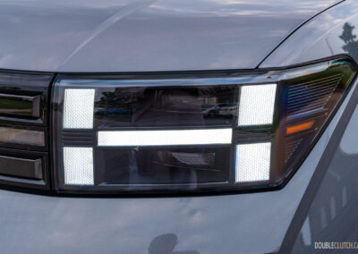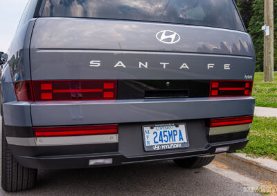 The new Santa Fe is striking, eschewing the bulbous and soft features of the previous generations for a boxy and chiselled look reminiscent of a Land Rover, but unique all the same among mainstream SUVs. The squared-off shape is almost old-school-SUV, with a flat hood and flatter face featuring a rectangular grille and squared-off headlights that illuminate in a clever H pattern — get it?! The Santa Fe’s rear end is probably my least favourite view; I think the rectangular tail lights are too low for my liking, making it look somewhat disproportionate. It’s not offensive, just a tiny blemish on an otherwise slam dunk of a design; the tail lights also illuminate in an H pattern to match the front.