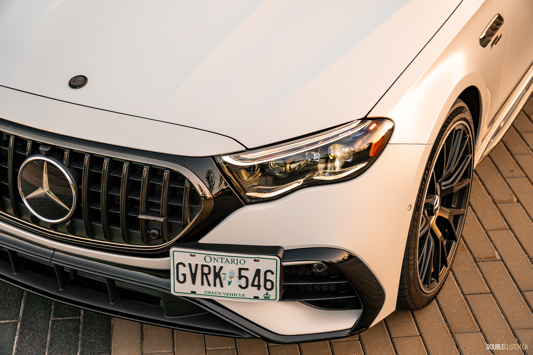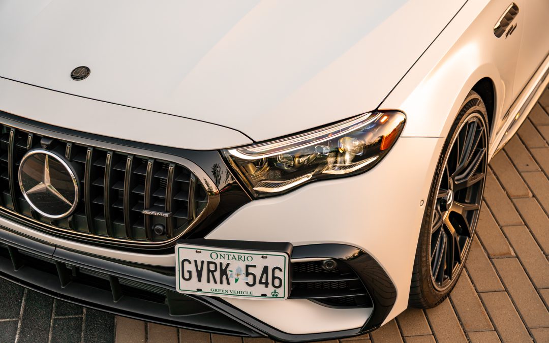 2025 Mercedes-AMG E 53 front corner close-up showing headlight, grille, front wheel