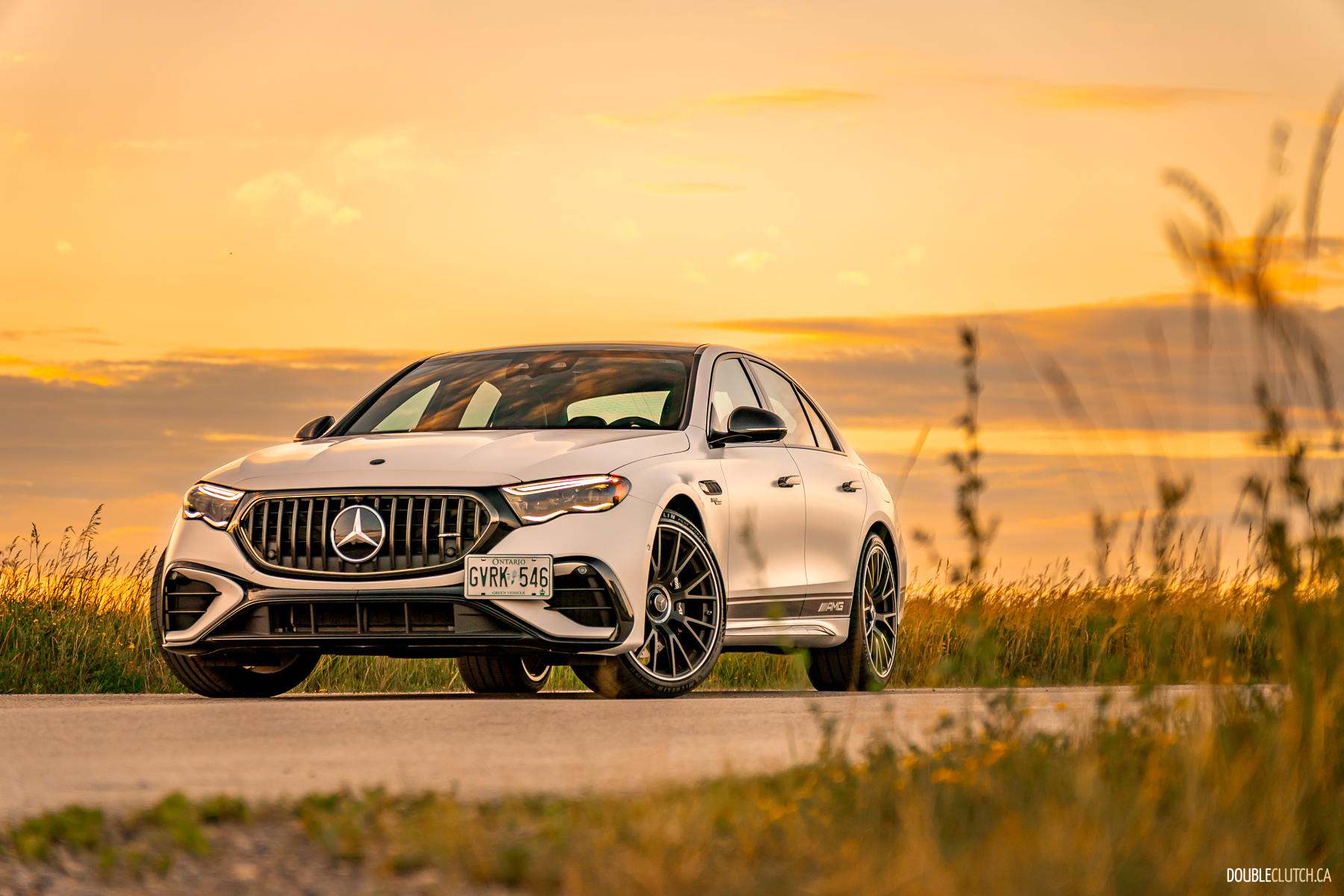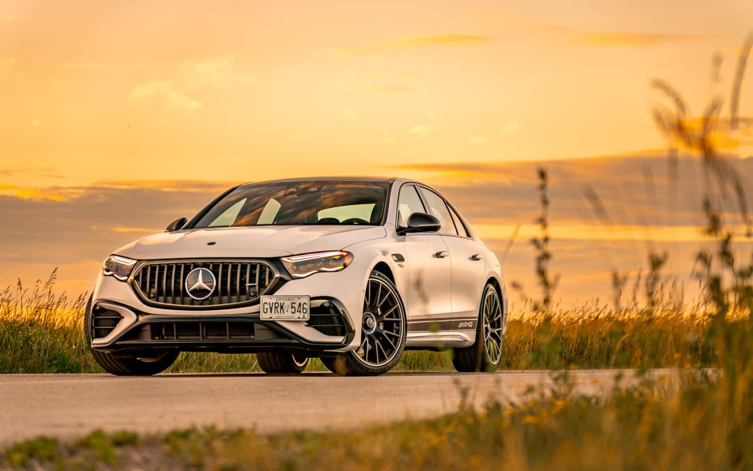 2025 Mercedes-AMG E 53 front quarter view at sunset