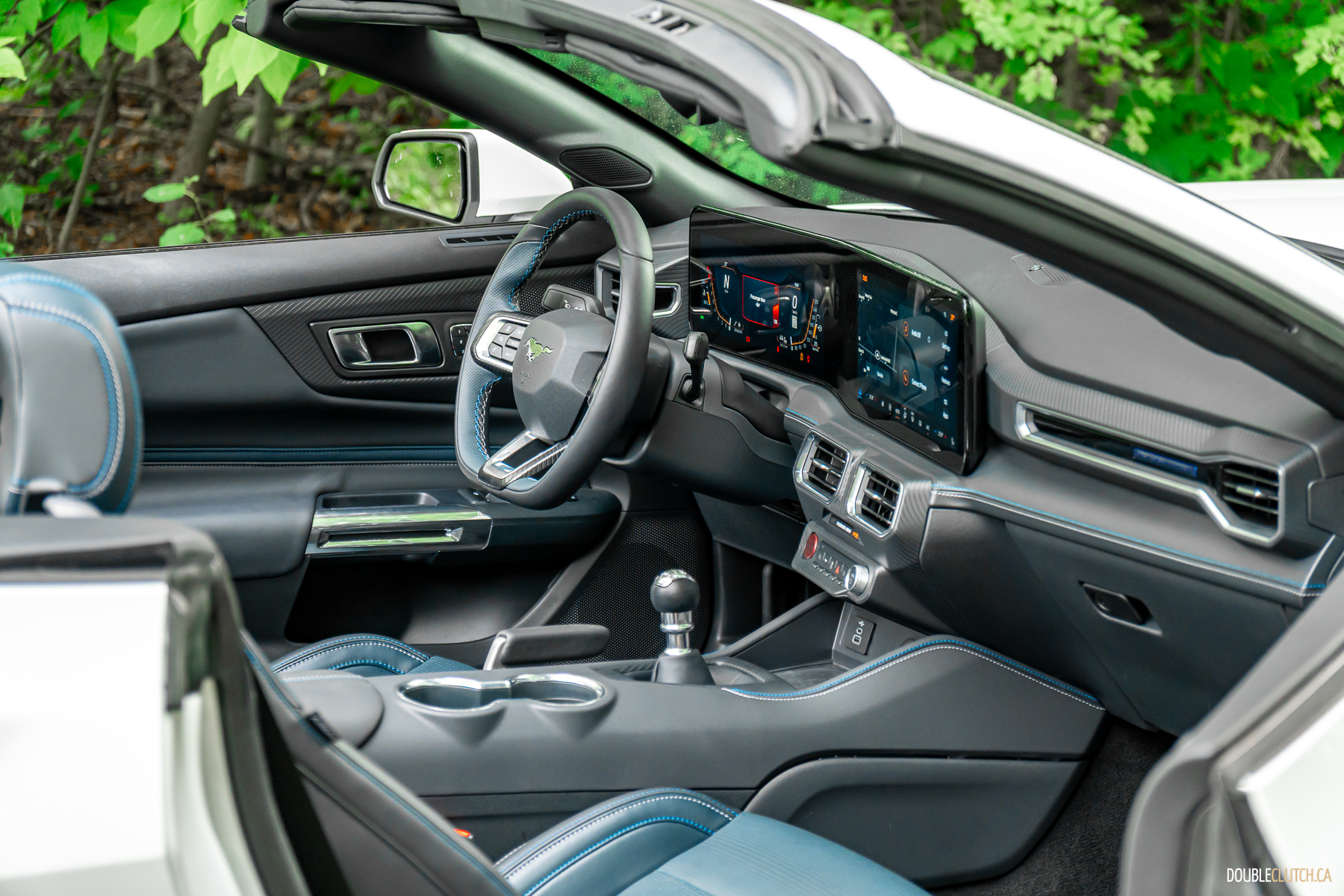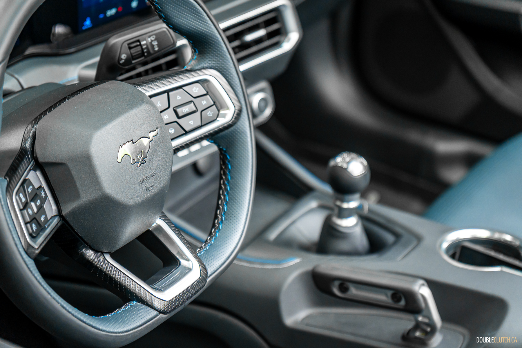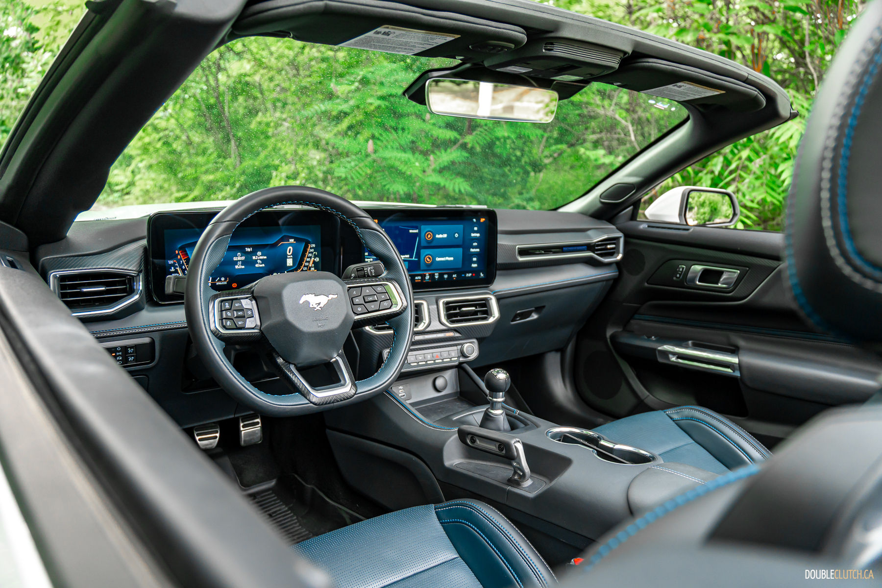 The rest of the interior is pretty straightforward. Ford modernized the dash layout for this latest generation; the physical gauges and retro toggle switches of yore are a thing of the past now, moving to a dual-screen layout with a haptic feedback touch panel below. Purists might not be fans of the new layout, but this layout is more modern and has more mainstream appeal. Thankfully for the Mustang faithful, you can choose between three retro gauge cluster layouts. At least the screens are clear and easy to navigate, the infotainment worked like a charm, wireless CarPlay and Android Auto are standard, and when you aren’t listening to the engine sing, the optional Bang & Olufsen sound system is pretty impressive.