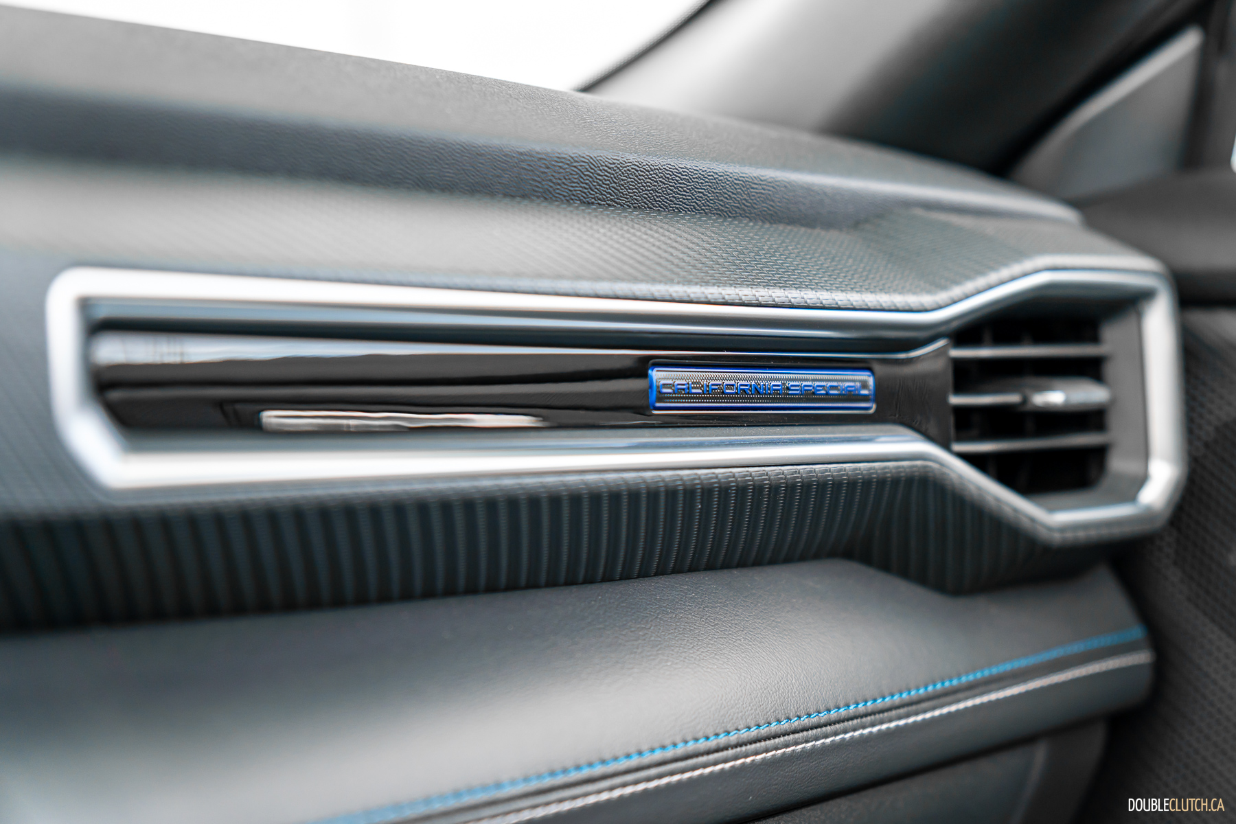 Our particular tester is the California Special edition. It’s a cosmetic package, adding blue accents all over, inside and out. The blue trim on the wheels, front grille, and stripes can be a bit polarizing; it was a bit much in my opinion, and the blue wheels need to go. It’s a bit more tasteful inside, with blue stitching, trim, and two-tone blue-and-black seats.