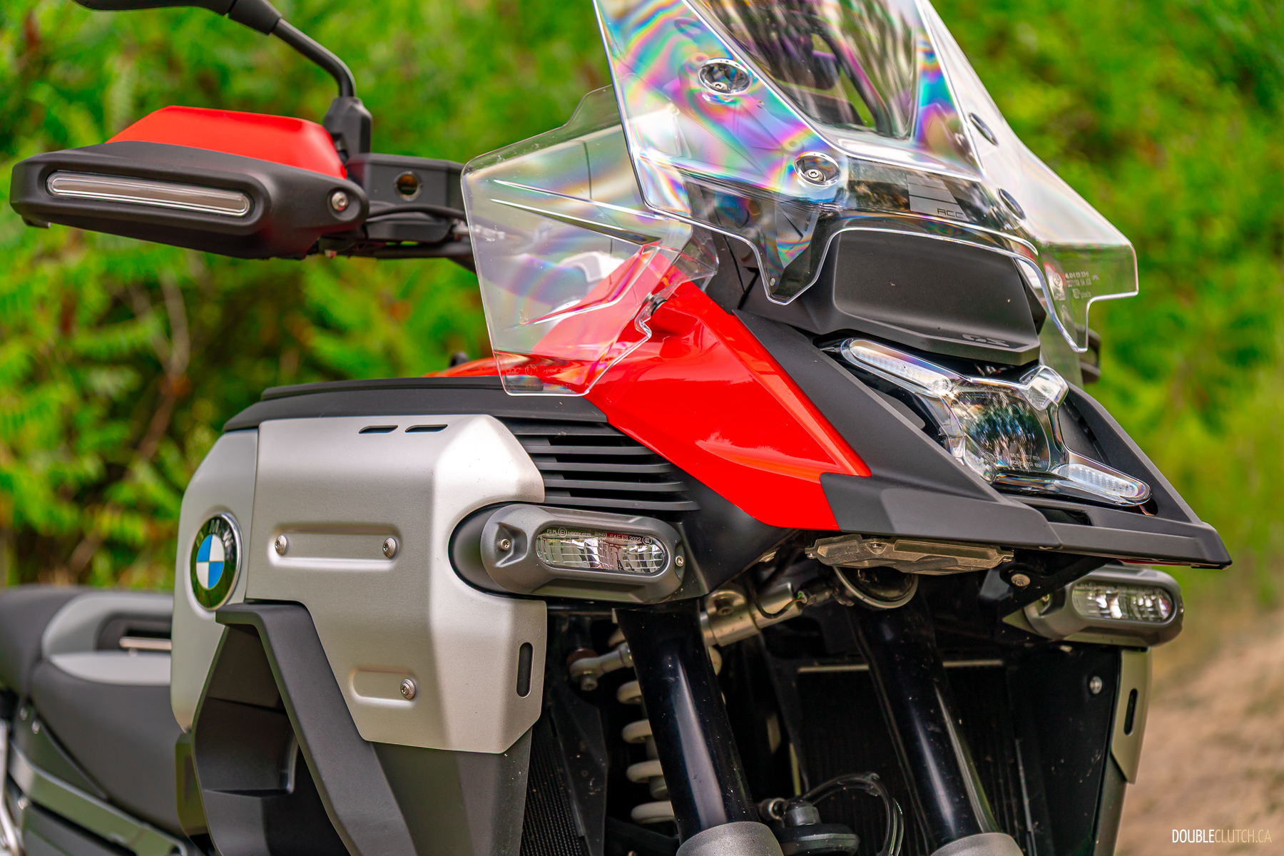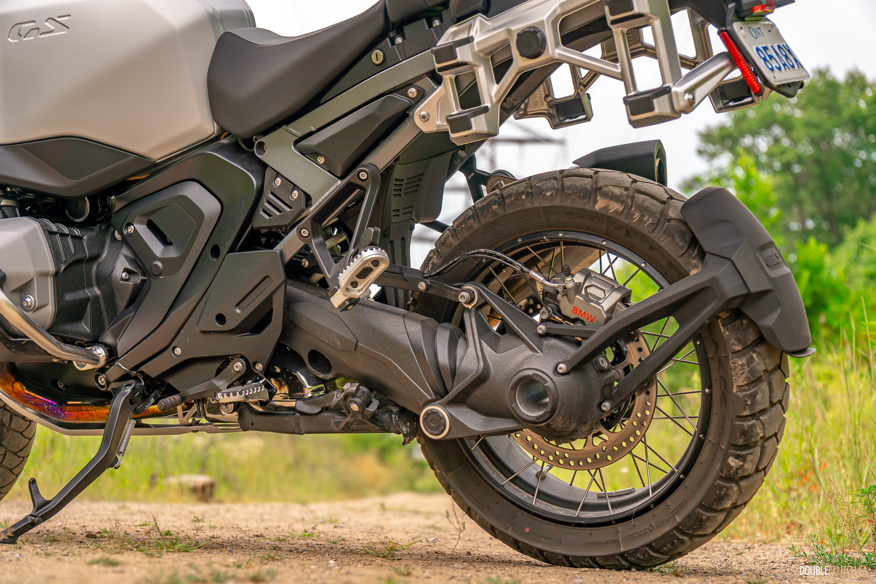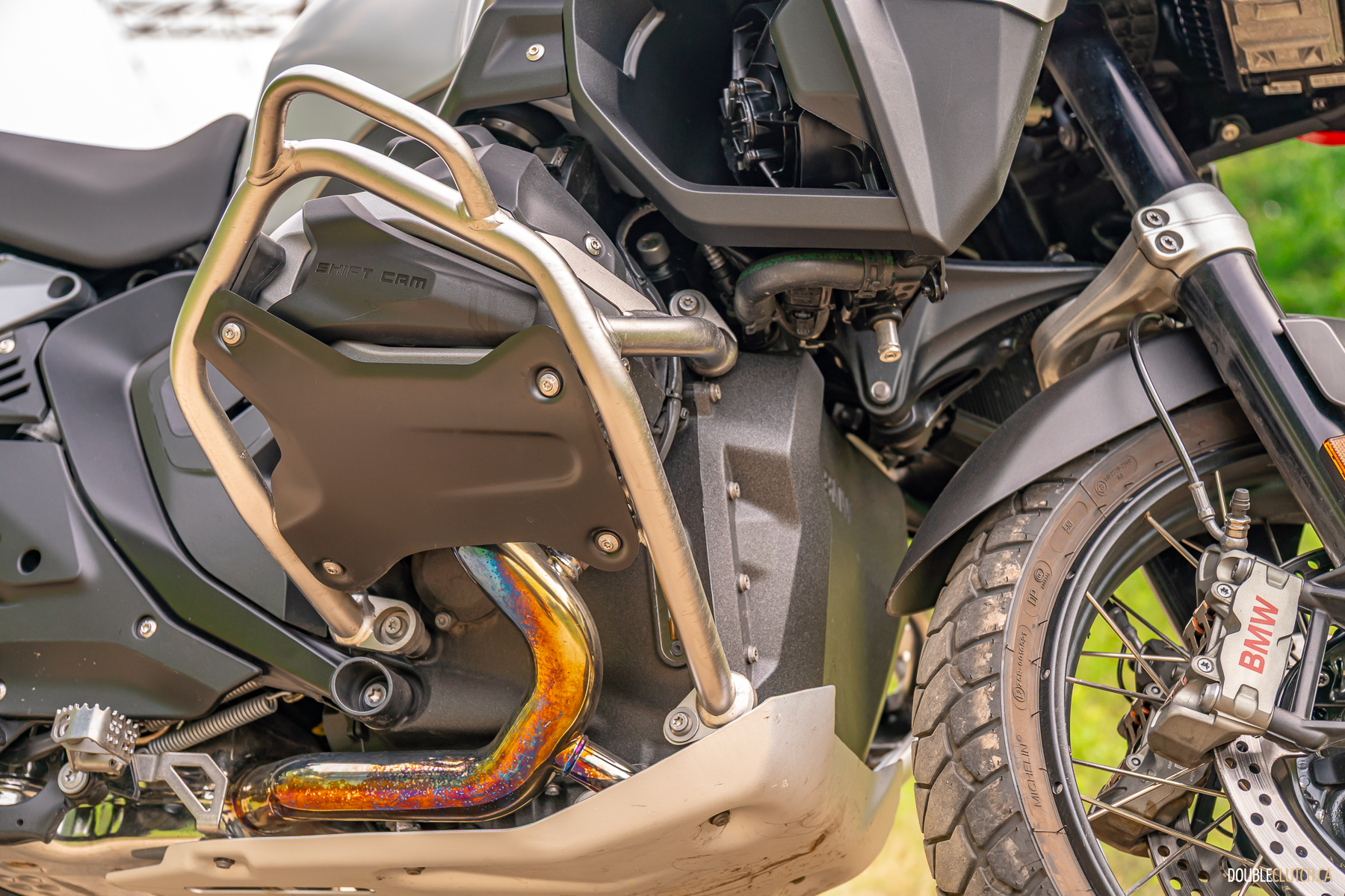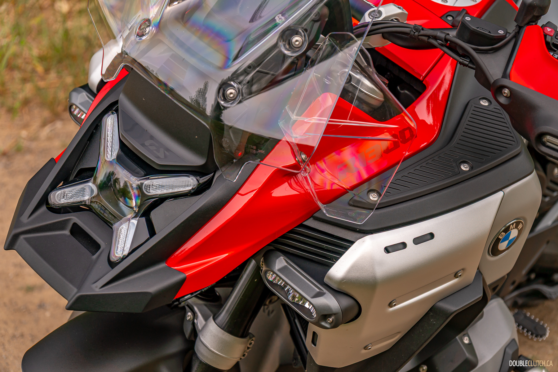 It’s a large bike for sure, but it’s visually gigantic. A colossal, 30-litre fuel tank sits atop of two radiators and electric fans, with big handlebars with even bigger hand guards up above. Its honking, 1,300-cc engine spilling its cylinder heads out of both sides, each encased by beefy guard bars. A big, X-shaped LED headlight, a full complement of wind deflectors, and an overall angular yet striking design only add to the R 1300 GS Aventure’s sense of bigness.
