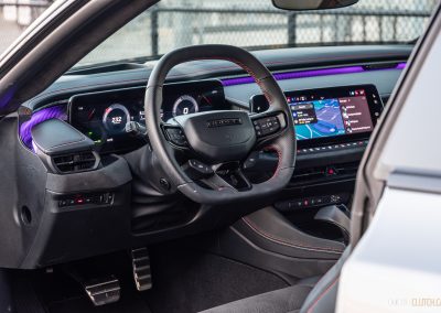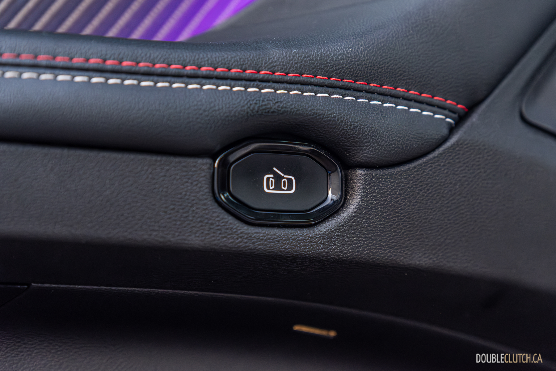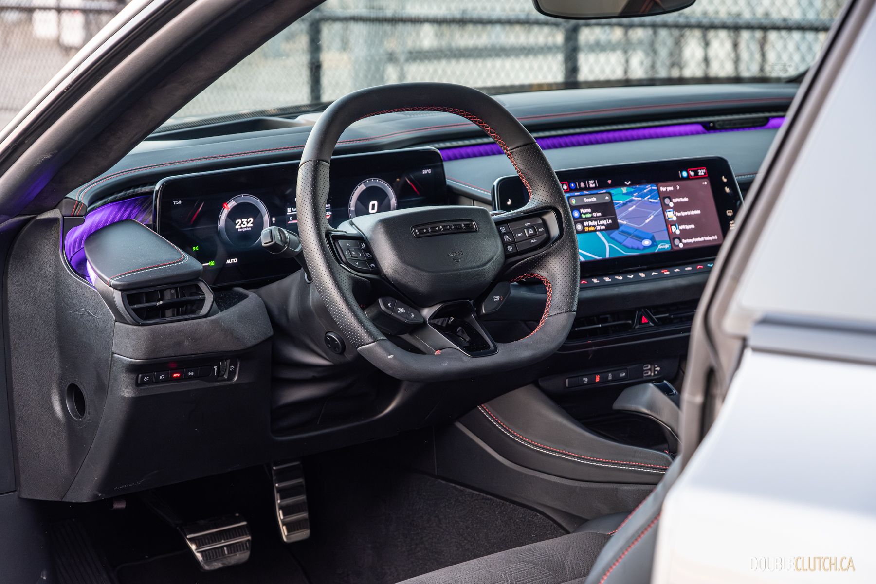 The unique glow of the ambient lighting on the optional carbon trim looks fantastic, and spans essentially the entirety of the doors and dash. The suede trim from the same optional package adds a nice premium touch to the cabin. It’s one of Dodge’s nicest interiors in my books. The 12.3” infotainment screen that runs the latest UConnect software looks and works pretty well, although there are some instances of lag. Same goes for the digital instrument cluster, which looks great but reacts slow to drive mode changes and has a slow refresh rate for the gauges.