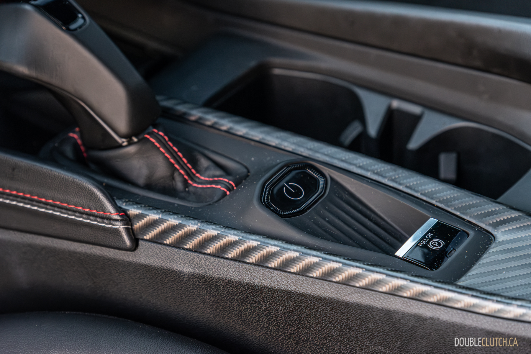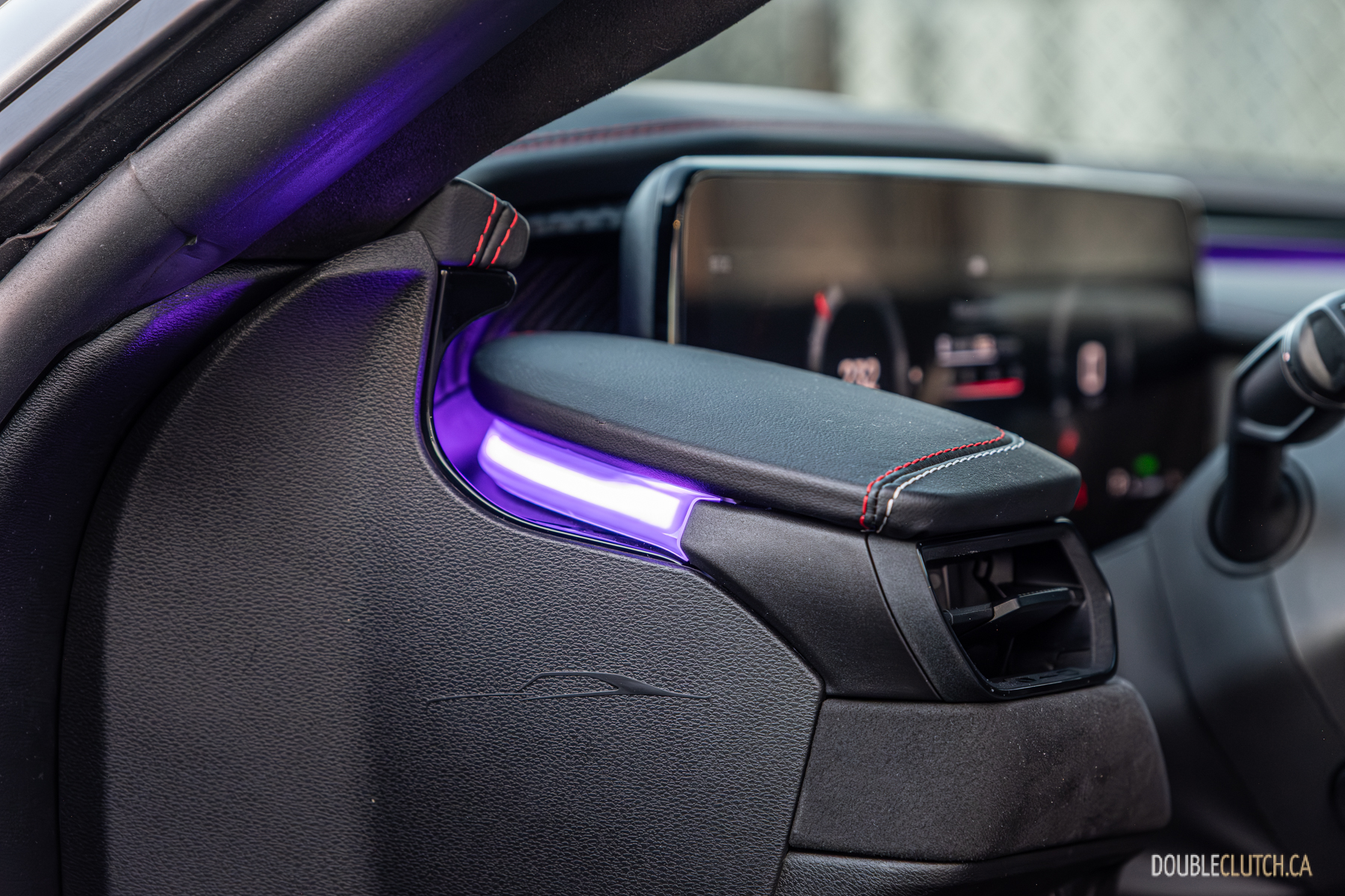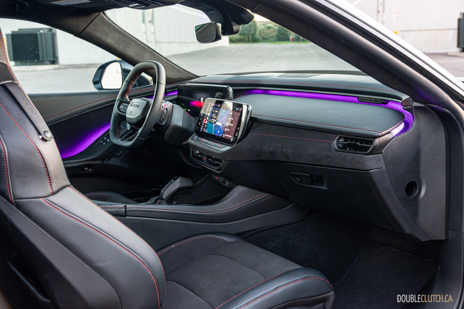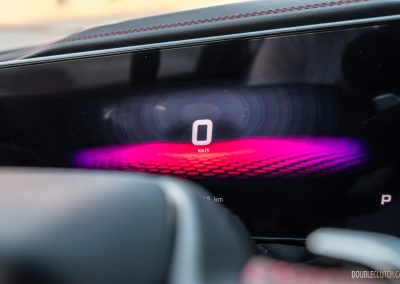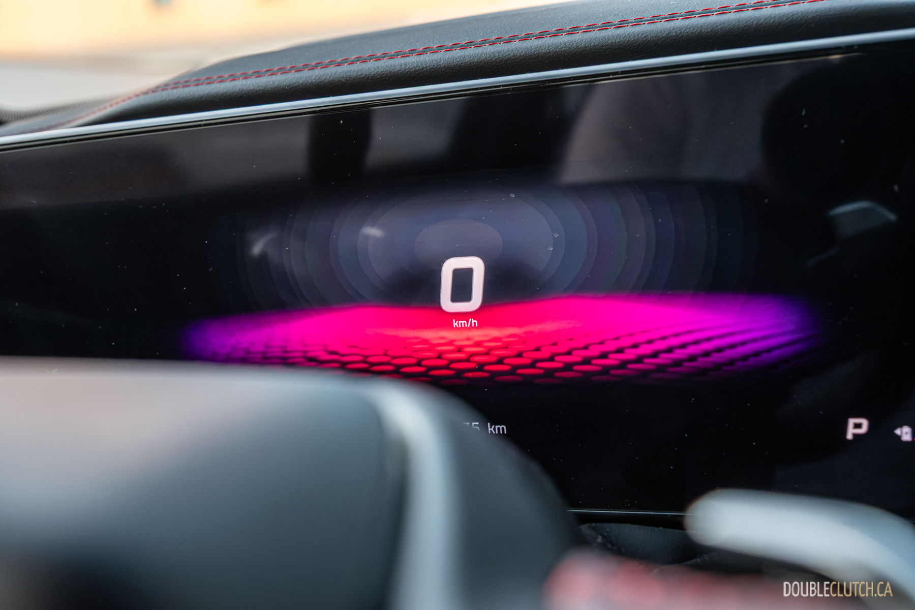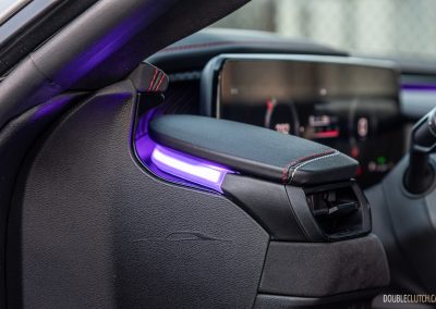 The result is….mixed. The startup sound is LOUD, and blends a bit of an old school V8 sound with a spaceship whirr. I’ll admit it sounds kind of cool but it’s hard not to feel a bit embarrassed knowing it’s completely fake. Idle sound and vibration varies in different drive modes, with track mode resulting in a loud “burble” that reverberates throughout the cabin. From the inside it doesn’t sound half bad, from the outside it sounds a tad too synthesized. Same goes for when you’re on throttle, it sounds pretty good from the inside but a little too fake on the outside, unless you’re at a distance from the car.