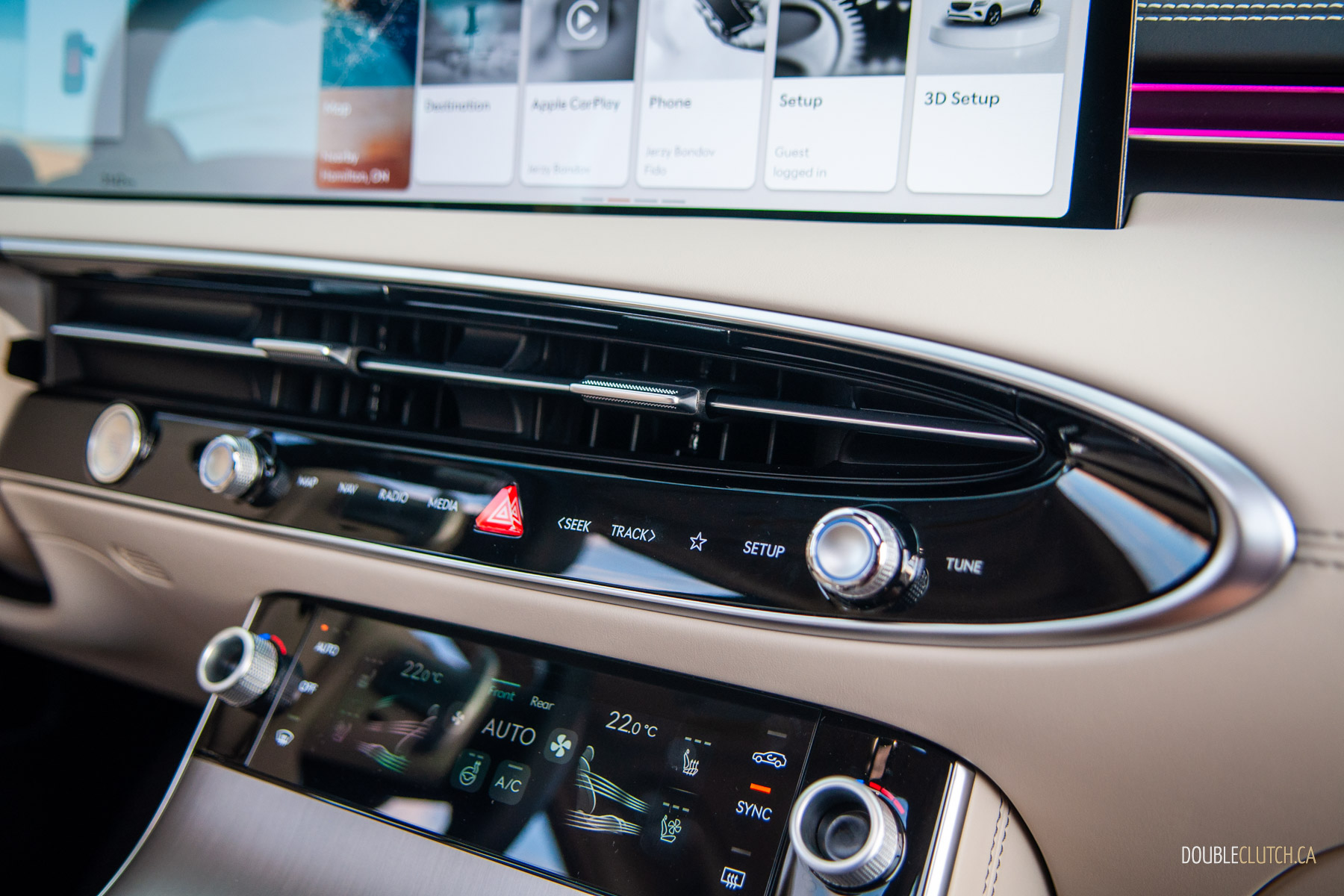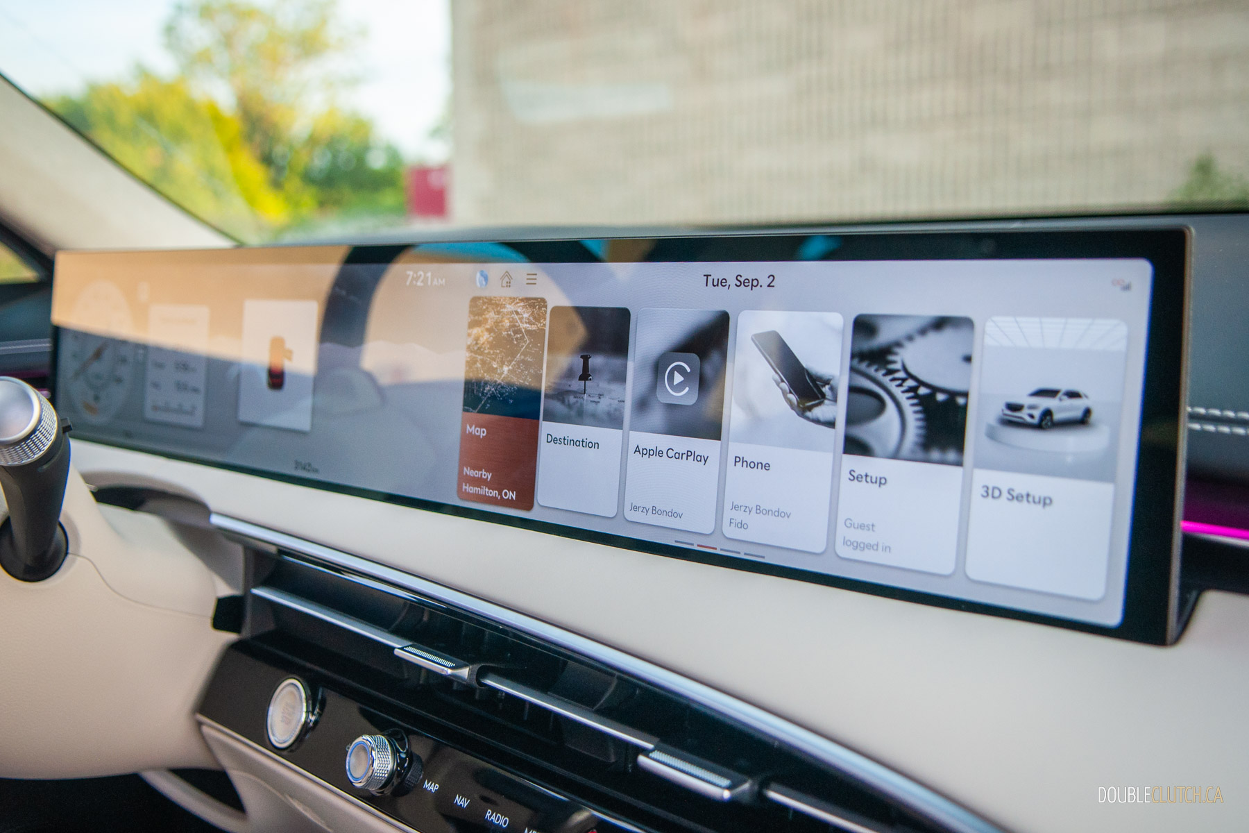 Inside, the centrepiece to this updated 2026 GV70 is the new 27-inch display, but we’re a little conflicted. On one hand, the whole one-piece gauge-cluster-and-infotainment-touchscreen combo is a dime a dozen; how is this something to brag about when it’s the same basic look as a Kona? On the flip side, Genesis’ execution here is impeccable—you can often tell it’s two, sometimes three separate displays under one piece of glass, and once you see it in those cars, you can’t unsee it. But the GV70 uses an entire OLED display, resulting in a truly seamless look. It helps that the software you’re poking-and-prodding at is as crisp, responsive, and easy-to-use as it’s always been. Wireless CarPlay and Android Auto are now finally a thing, too.