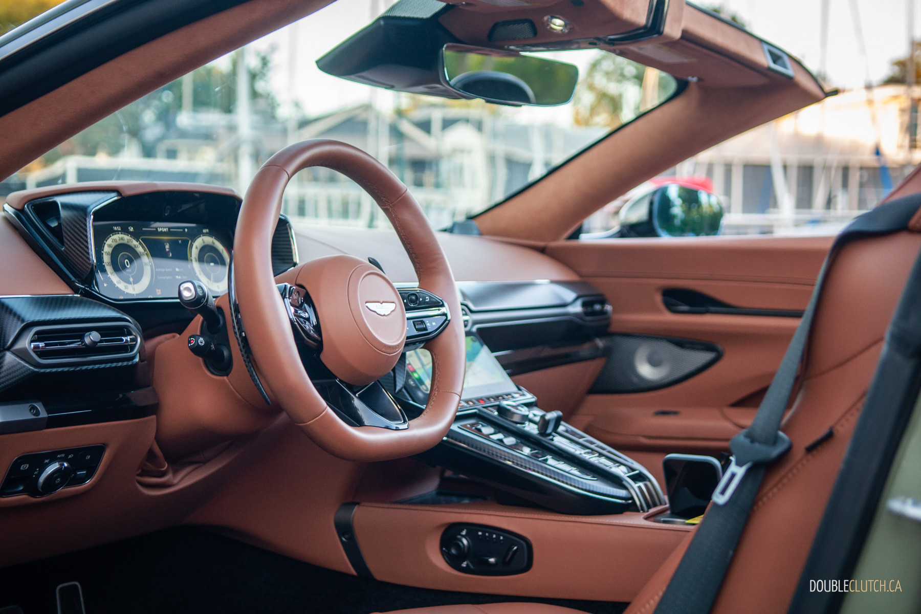 The vibes immaculate inside the Vantage, top up or down. The redesigned dashboard is more or less the same as the DBX and DB12, albeit locked to just carbon fibre trim. Still, it’s simply better than before; it’s better laid-out, better-looking, and better at hiding the Benz-ness now that the tech is all Aston. Both screens measure 10.25 inches and actually look like they belong. Apple CarPlay Ultra is a nifty feature that takes over most, if not all of the car’s digital real estate, but I kept it disabled for most of the week because Aston’s new, in-house infotainment is beautiful and works so well.