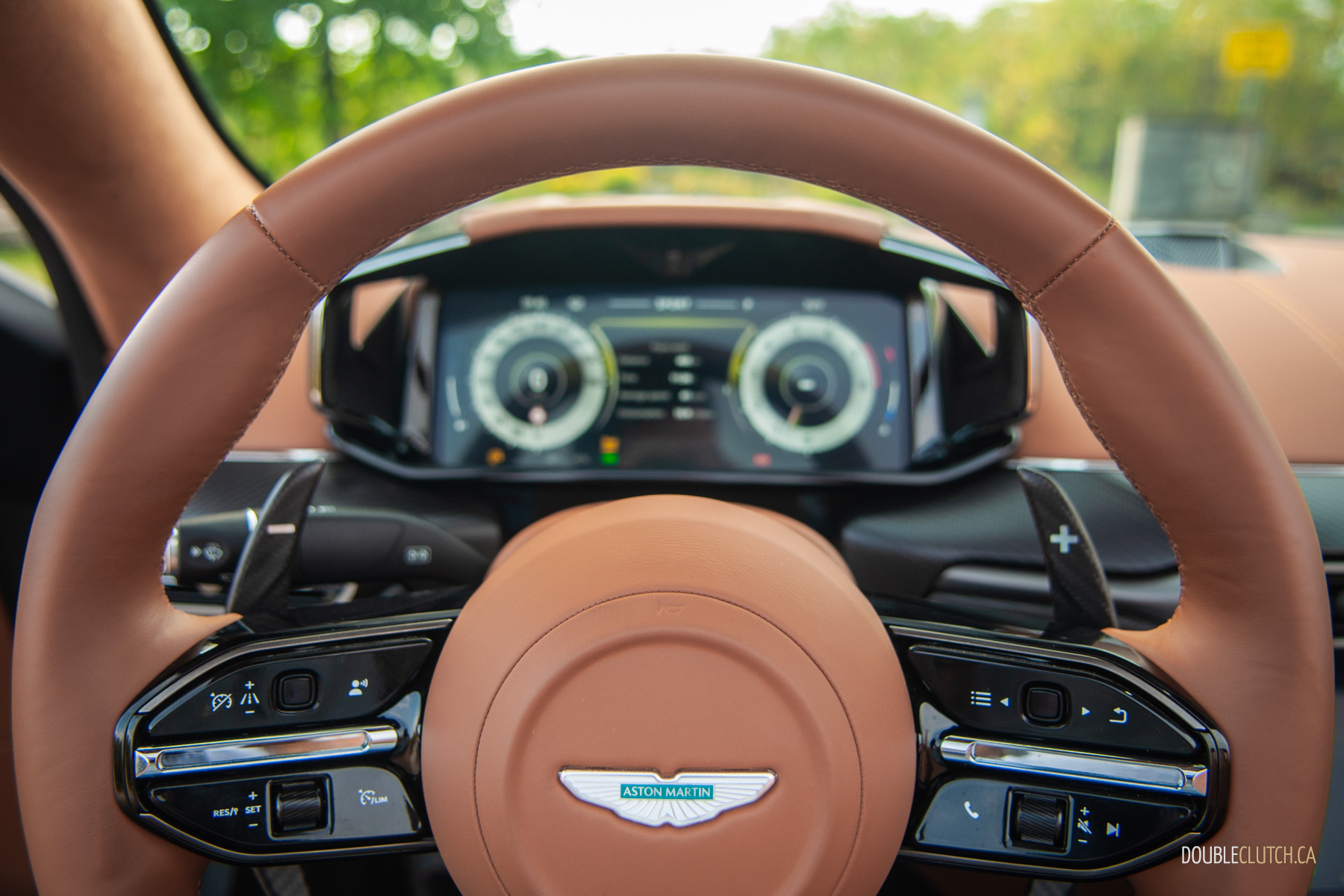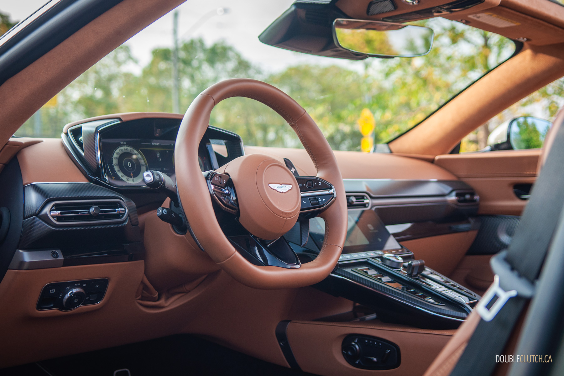 Below the infotainment end is a smorgasbord of physical switchgear including a dinky but beautifully knurled shifter, and the matte carbon fibre trim looks exotic even if I’d personally prefer wood. Fortunately, through Aston Martin’s colour palate and countless options, it’s easy to find something you’ll like. Or you can be boring and limit yourself to Silver Birch, Skyfall Silver, or Cumberland Grey with a black interior.