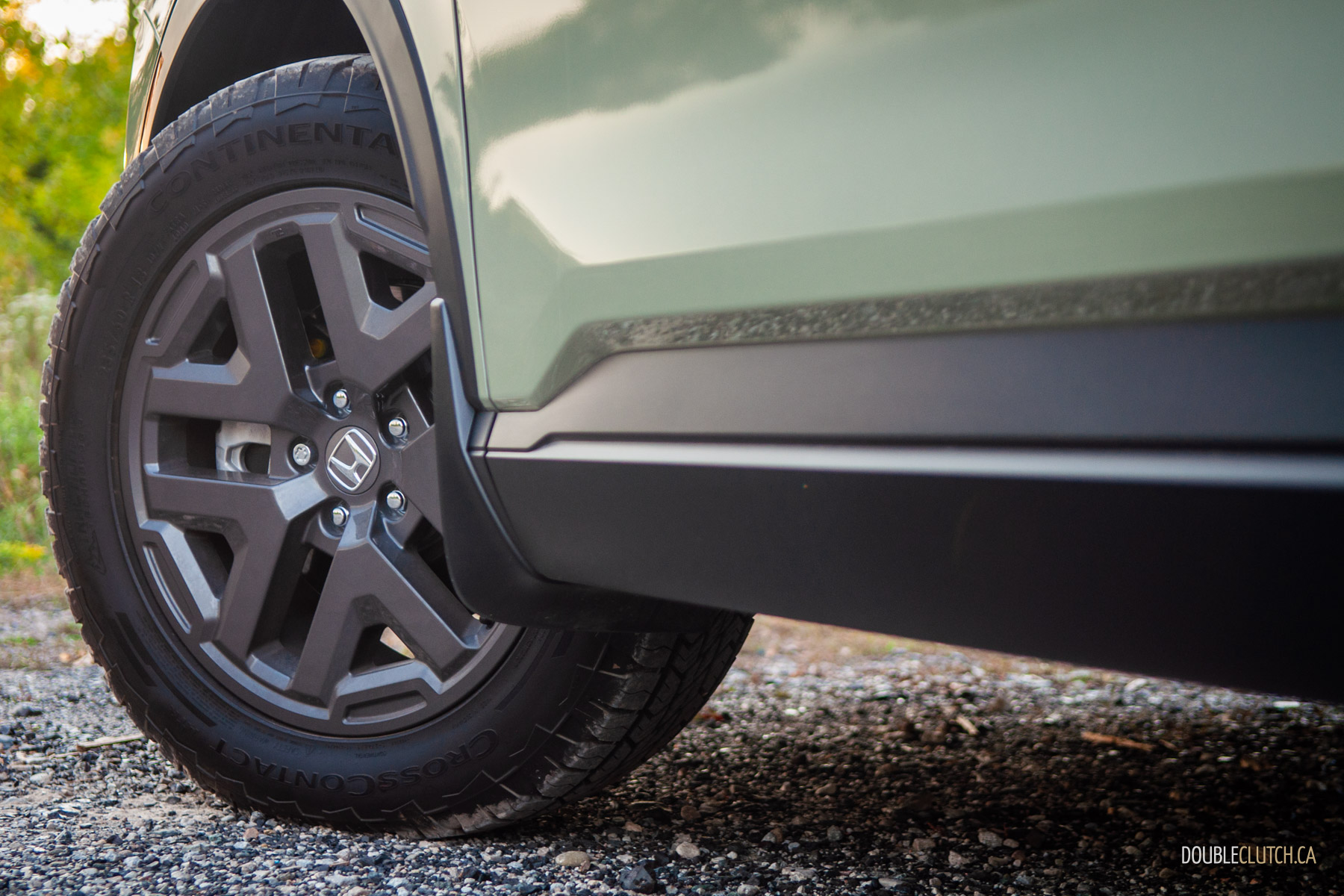 Of course, the big news for model-year 2026 is the new off-road-oriented Trailsport trim. It sits smack-dab in the middle of the CR-V lineup and serves as the second cheapest way to get into a hybrid. Our tester is dipped in a lovely new colour called Ash Green Metallic, contrasting nicely against a slightly meaner-looking front bumper. The bright faux skidplates front and rear add a nice contrast to the body cladding, and the orange Trailsport badges pop nicely.