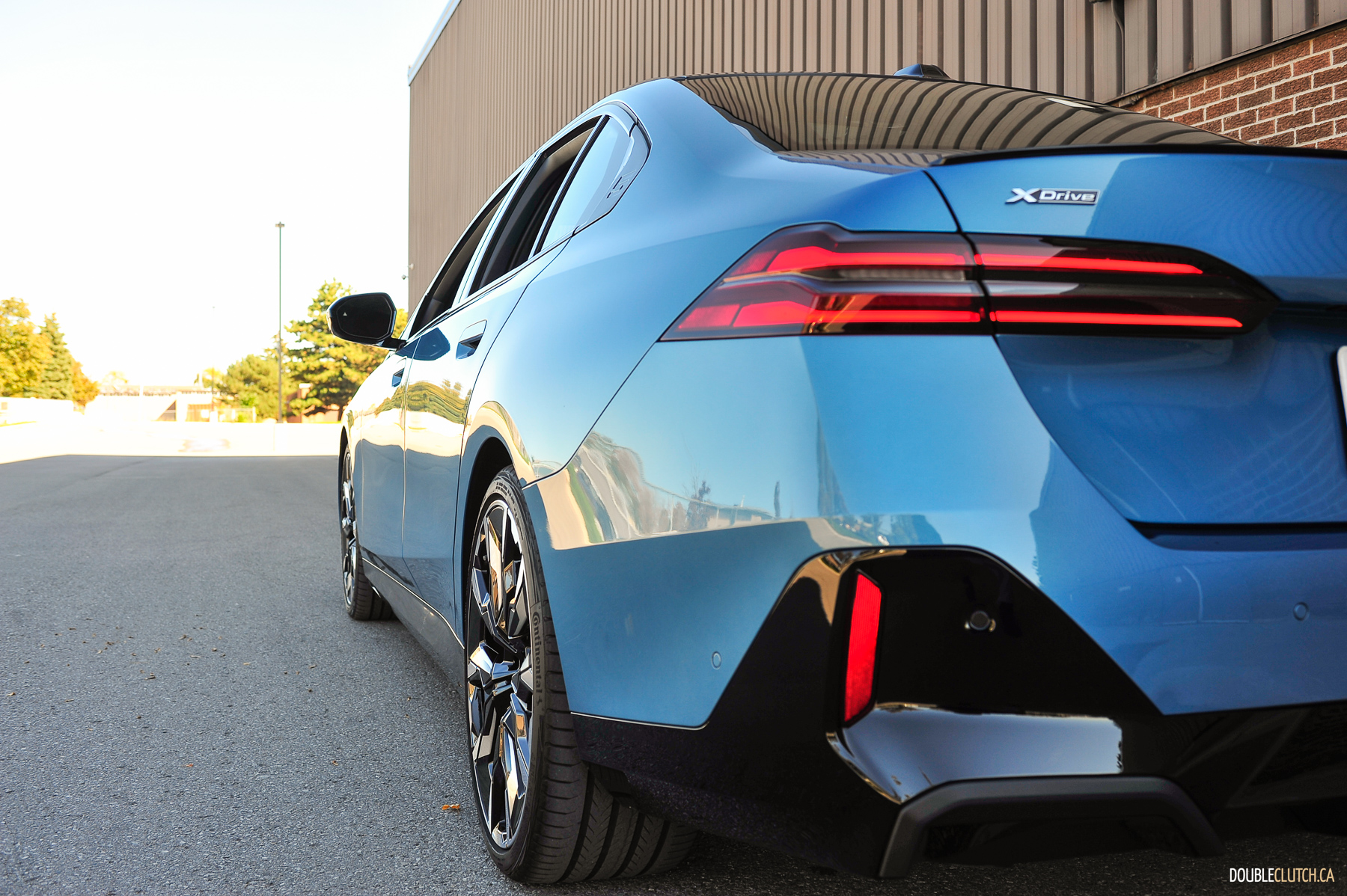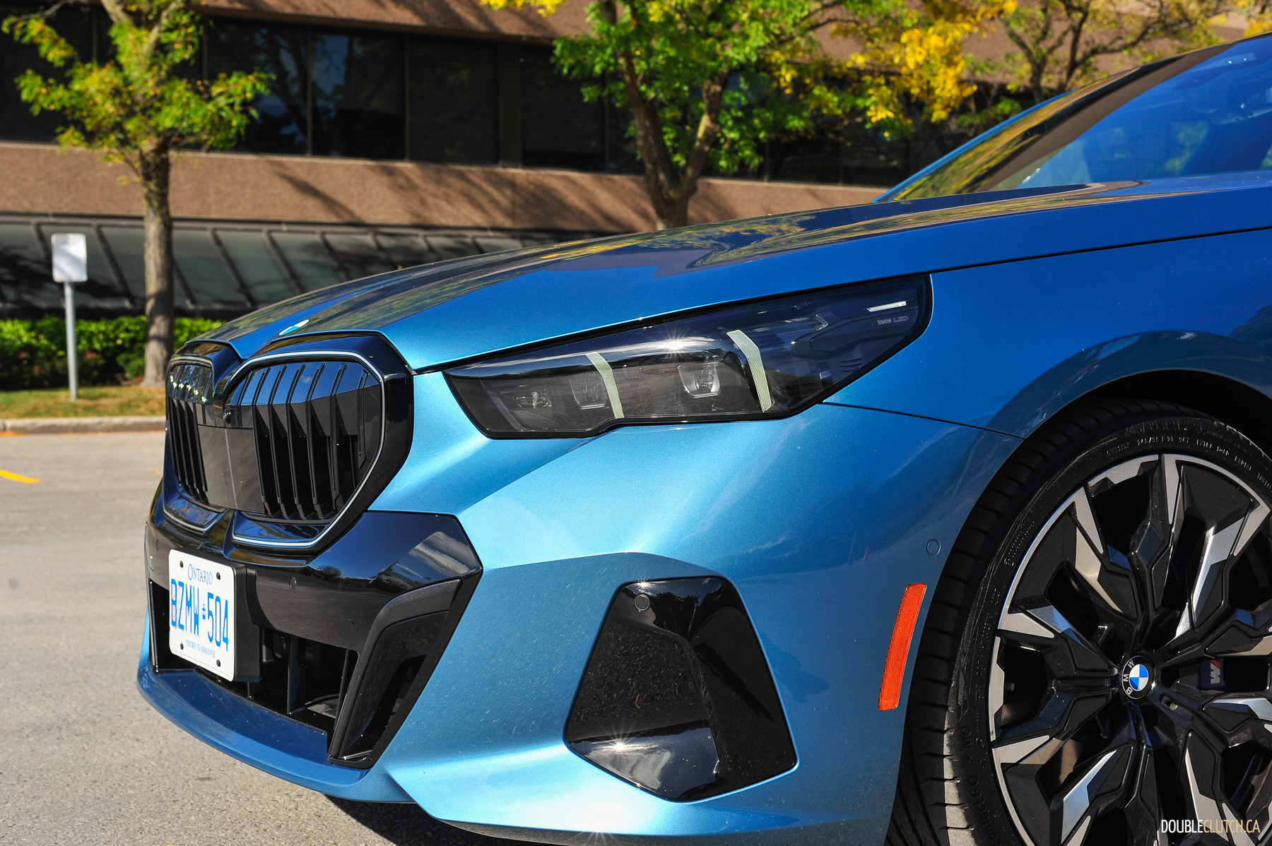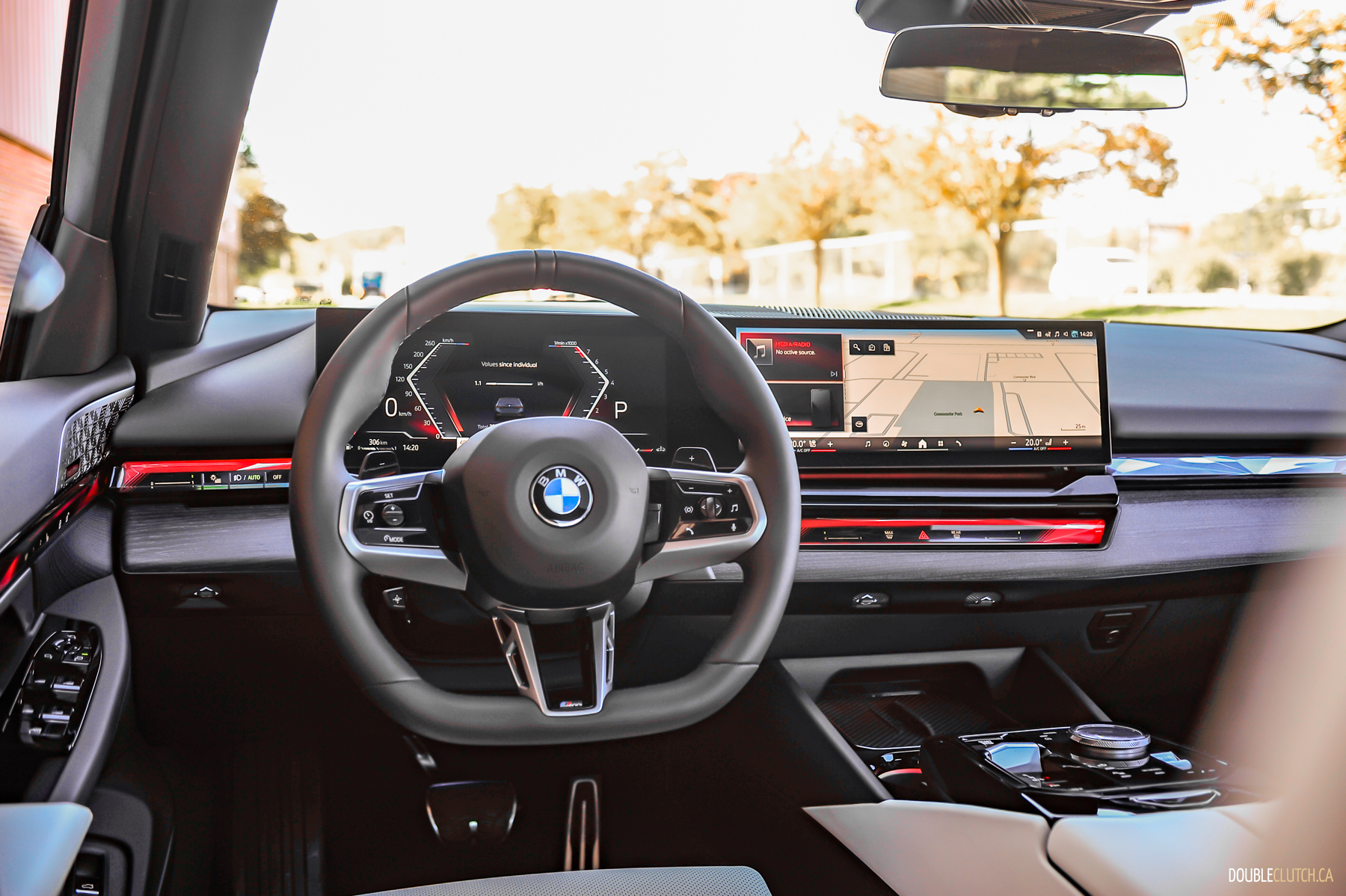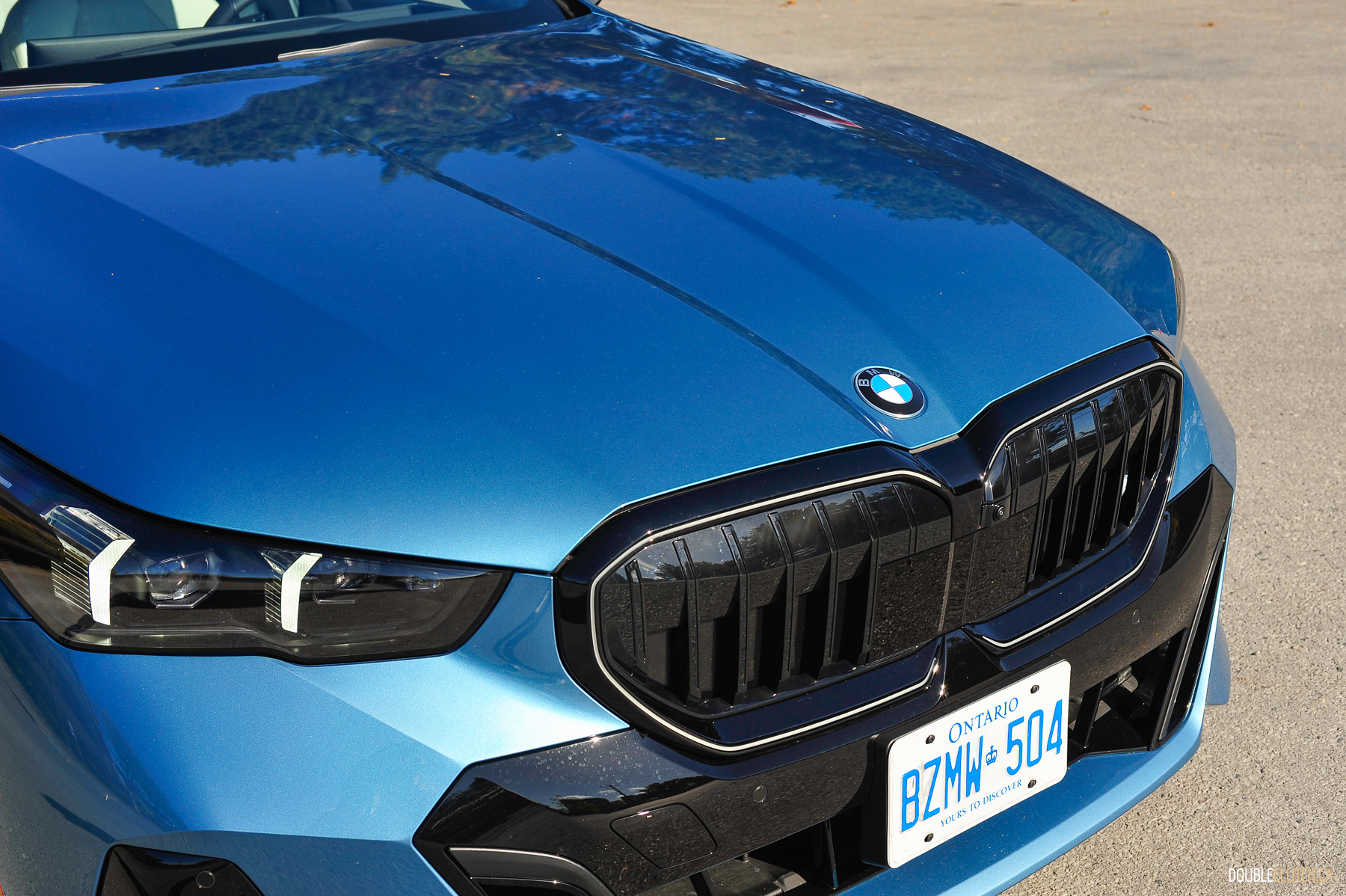 The front fascia, as with many BMWs of this day and age, takes some getting used to, especially with the pronounced kidney grilles that look more at home on an SUV than a “mid-size” sedan. To top it off, the outline of the grilles are illuminated, which is a love it or hate it attribute of the G60. Our tester’s Maldives Blue II Metallic over and Smoked White Veganza – BMW’s way of saying vegan leather – is a stunning colour combo that garnered lots of compliments from passersby and other BMW owners.