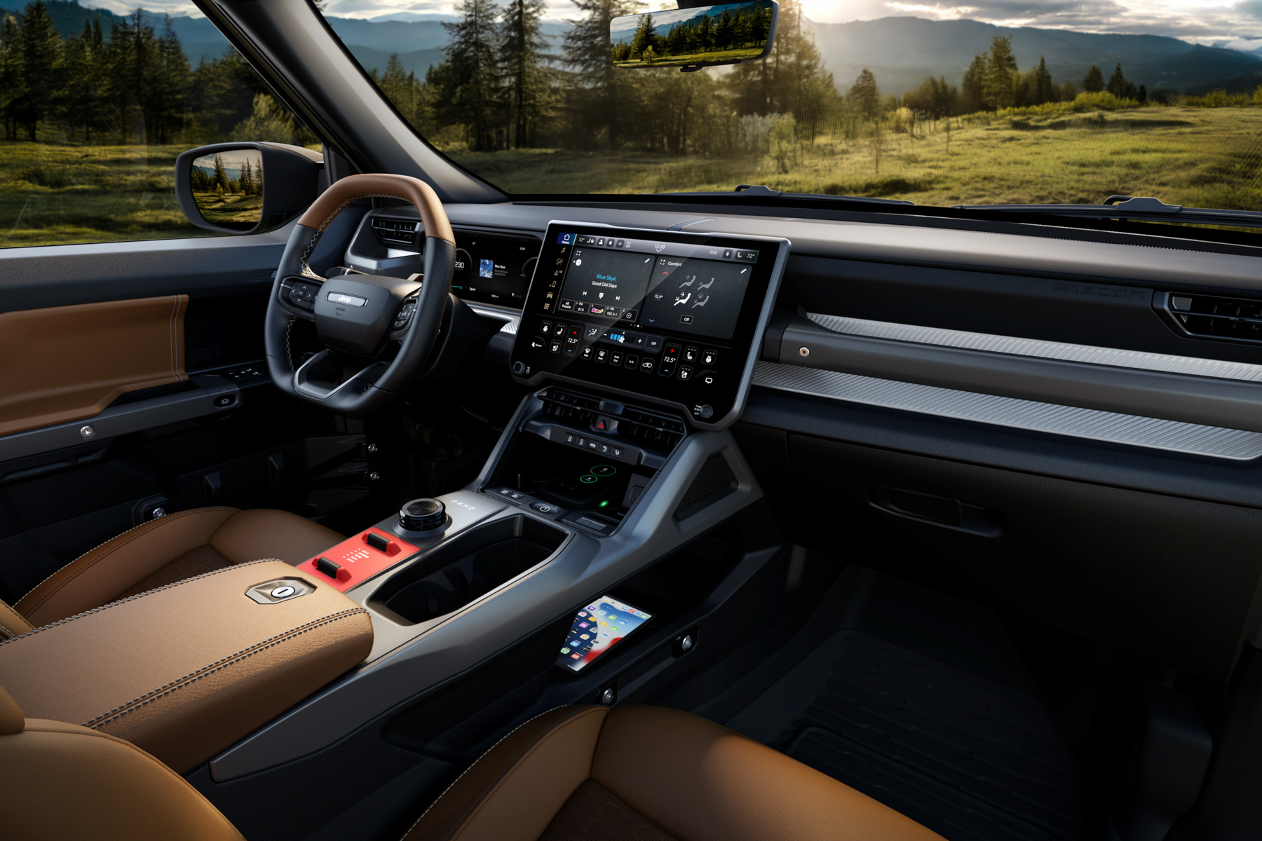 Inside, the Wrangler influence remains strong, but there’s some “fancy Jeep” sprinkled in. The dash design admittedly looks like a mishmash of Wrangler, Bronco, and Defender, but that’s a good thing. The touch points look chunky, the bar running across the passenger-side dash is perfect for whoever is riding shotgun to steady themselves as you send it through muddy puddles, and at 14.5 inches, Jeep’s biggest touchscreen ever juts out of the dash. It still runs Uconnect 5, and it’s supplemented by a 12.3-inch digital gauge cluster in its own separate binnacle. We’re not thrilled about the lack of physical switchgear for the climate controls, but at least they appear to stay on-screen all the time, and it still has a volume and tuning knob.