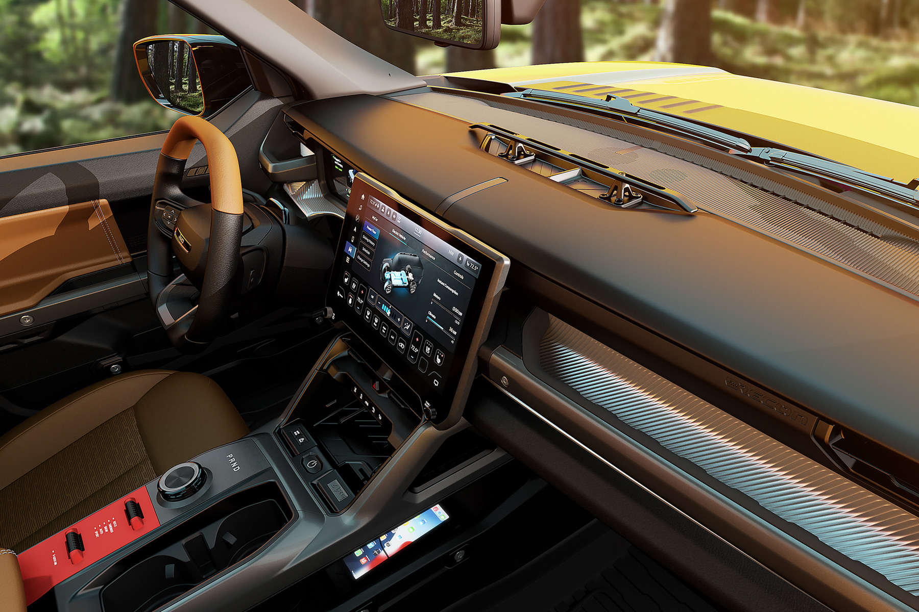 Right away, the 2026 Recon is recognizably Jeep. It draws heavily from the Wrangler, with its boxy aesthetic, tail light design, and externally mounted spare tire. The front end, particularly the headlight and grille treatment, is reminiscent of the reborn Cherokee. Keep squinting and there’s shades of Land Rover Defender with how the wheel arches bulge out, and the top half of the Recon could pass as a Bronco. The Recon will launch first with only the Moab trim, pitched as the extra-rugged