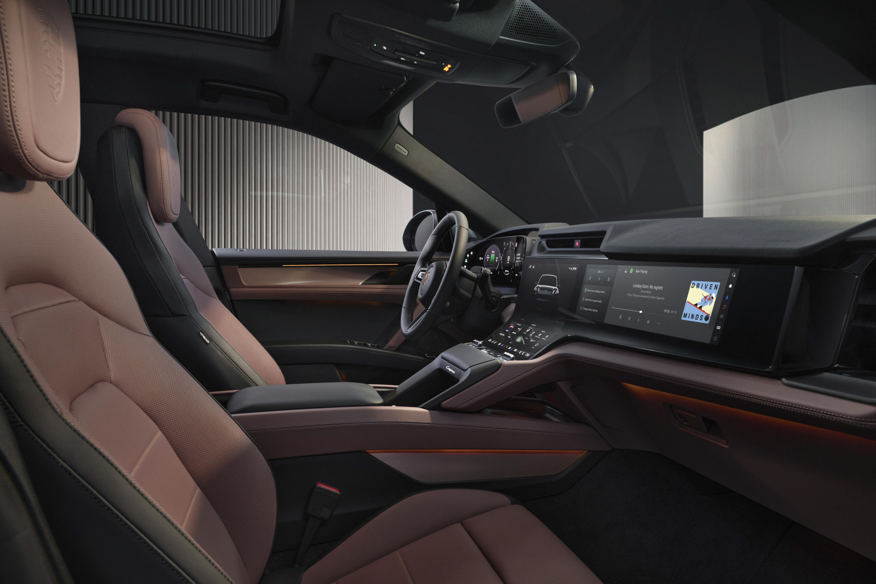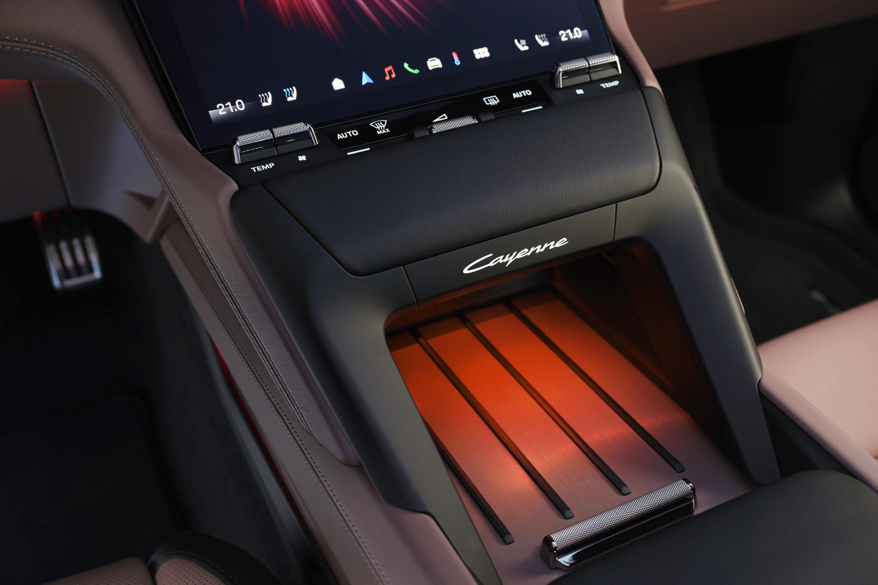 Inside, the Cayenne Electric doesn’t skimp on the screens. The central 12.25-inch touchscreen spills into a secondary screen encompassing the lower climate controls, a row of physical switchgear, and a wrist rest. As much as we complain about screen overload and gloss-black-everything, this solution does look slick, and as fans of mouse pads with jelly wrist rests, surprisingly ergonomic. Of course, there’s an optional screen for front passengers as well, and a 14.25-inch display serves as the gauge cluster. It all looks well-integrated, and because it’s a Porsche, probably well-built.
