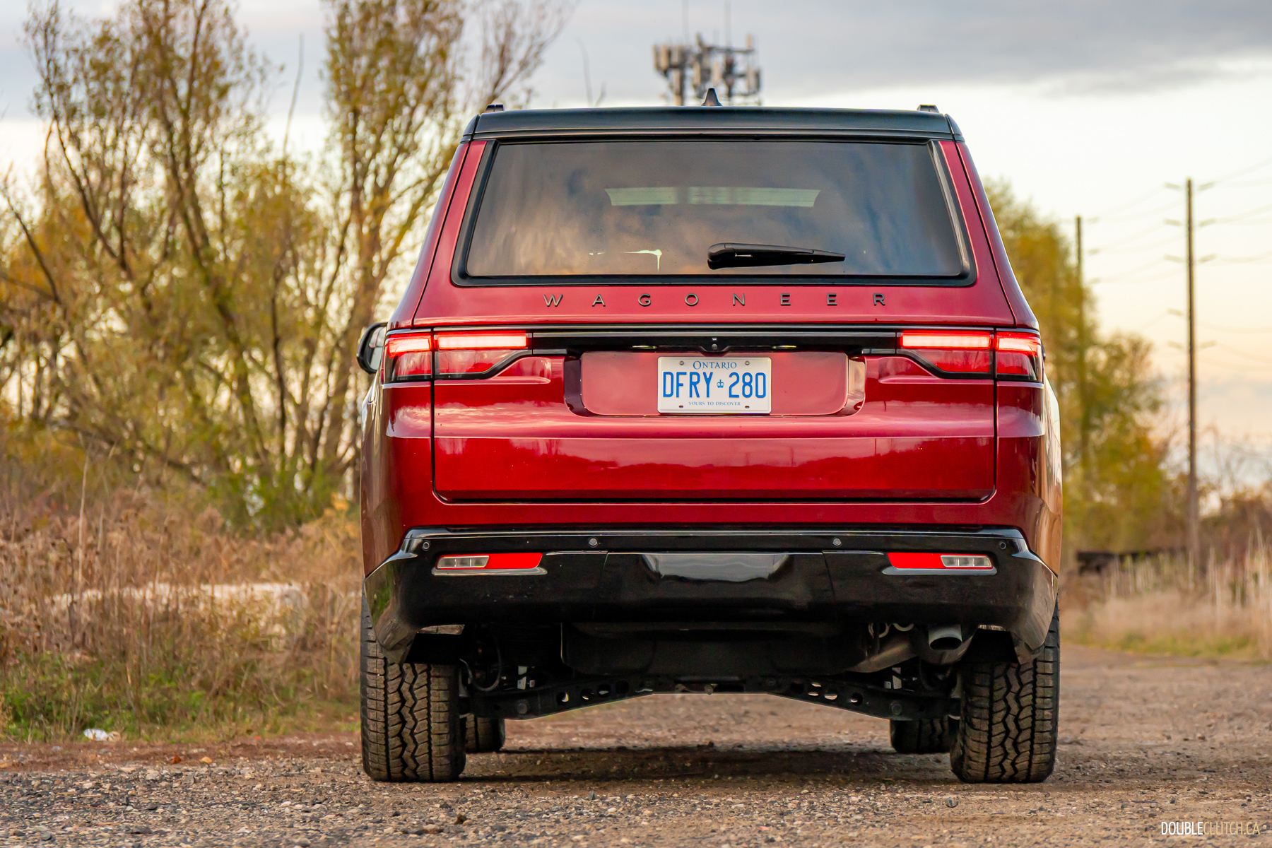 I always felt that the Jeep Wagoneer was almost incredibly good-looking, undone by the awkward U-shaped windows, highlighted by chrome bling on the loaded “Grand” Wagoneers we’ve tested. This “lesser” Wagoneer finally gets to be the handsome rig it always should have been, with the black trim and black roof toning down the curious silhouette and making it look right without trying too hard. The machined face of the 20-inch wheels adds a little zing of brightwork for contrast, and the deep Velvet Red metallic paint gives off a very upscale vibe. It also looks smaller than it is; I was shocked to see that the visually huge Ford is smaller in every dimension.
