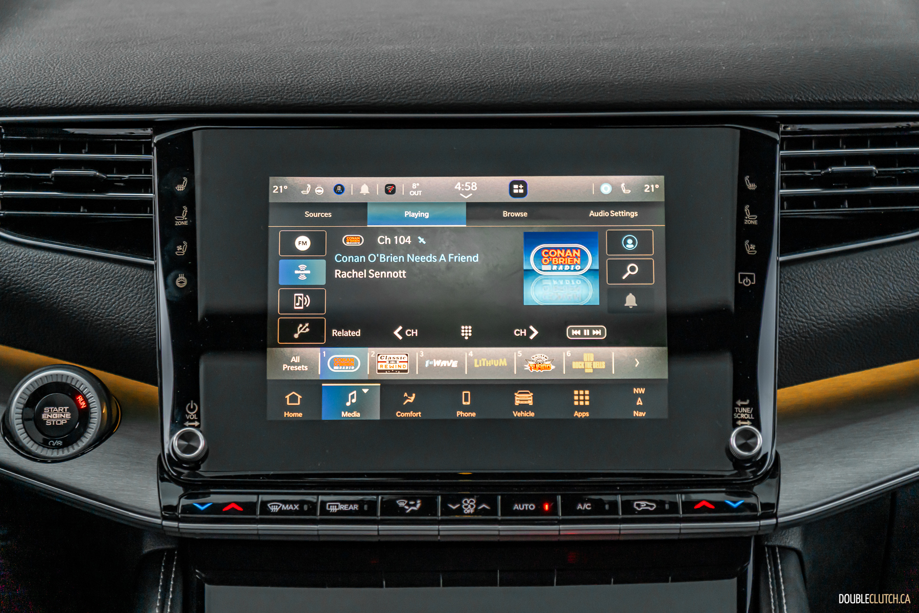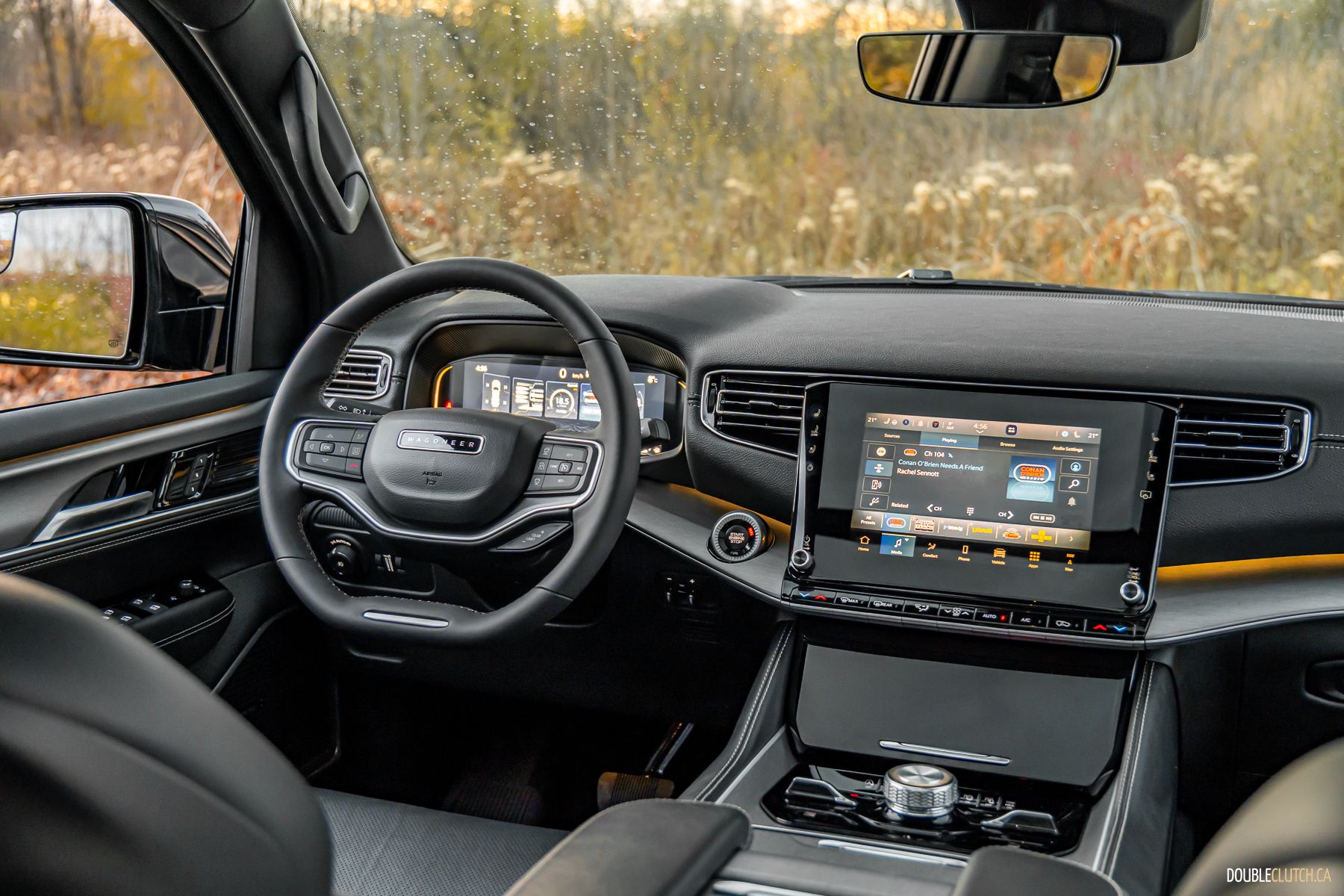 The Jeep Wagoneer has a nice, leather wrapped steering wheel, with easy-to-see physical buttons on its face, and rocker switches for volume and tuning on the back. It doesn’t achieve perfect marks in this category though, as the bottom of the steering wheel is flat and thickened at the bottom to accommodate a metallic trim strip. I see what they were trying to achieve, and it’s not too distracting, but it’s unnecessary.