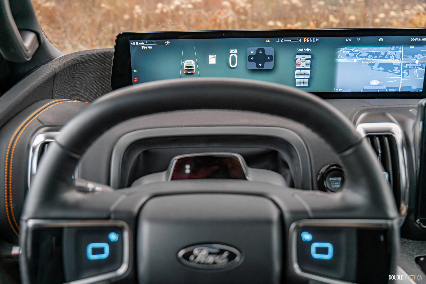 The Ford uses the same cursed square-circle squircle that debuted as part of the Digital Experience on the Lincoln Nautilus. It is fairly minimalist, with only flat thumb pads and context sensitive controls that project onto the screen in front of you, highlighted by metallic trim. Despite being fairly small, it feels less unnatural to actually steer with than you might think, and you can still “palm it” for parking lot maneuvers, but it looks completely out of place and undermines the entire rest of the cabin design. You know the expression “don’t re-invent the wheel?” Ford literally tried to do that exact thing; do not do that thing. I don’t care if I sound like a curmudgeon, I know I’m right.