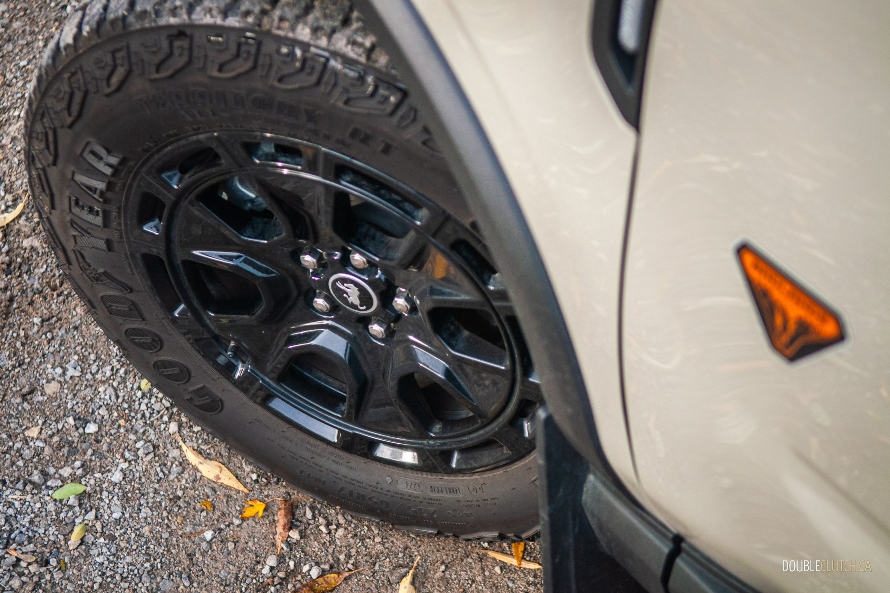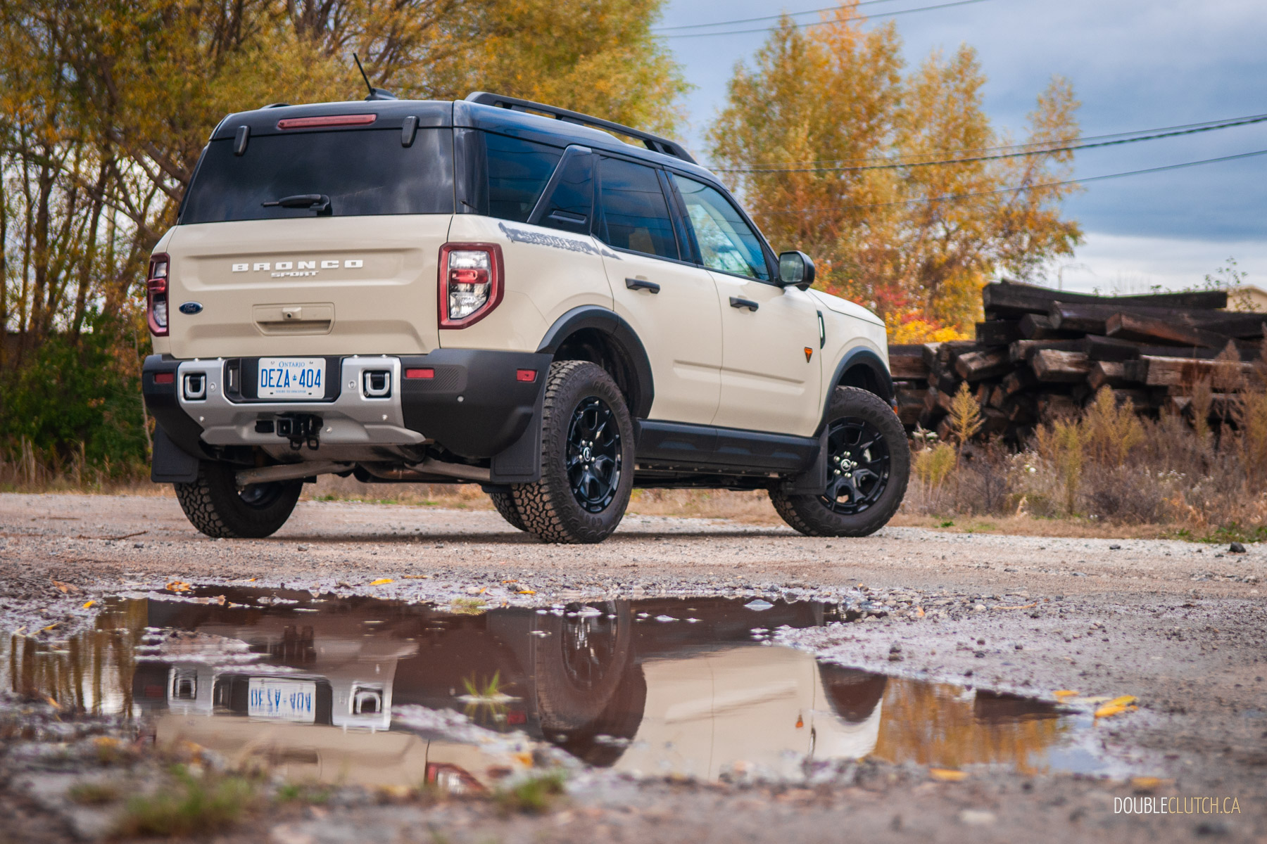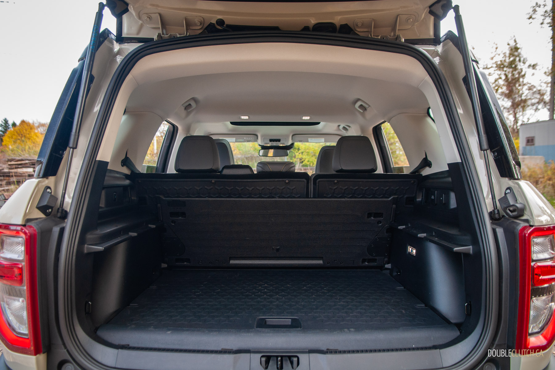 The tall, almost old-school Land Rover Discovery-like roofline means headroom is extremely generous regardless of where you sit, especially in the back, but legroom for adults can be tight. Similarly, cargo space isn’t class-leading — you get 920 litres with the seats up, and 1,846 when stowed — but it’s usable and keeps the tricks from launch. The glass can flip out independently of the hatch, the floor and seatbacks are all rubber — you can spec a full carpet delete on the Sport Sasquatch, too — but the novelty of the optional cargo divider wore off. It’s a nifty idea, serving as a second level for the cargo floor and it slides out and converts into a picnic table, but there’s no dedicated storage area for this extra piece inside the Bronco Sport. At least, not one that we could find. We almost forgot about it twice when we needed to yank it out and haul some longer items. Also, where’s the power liftgate?!