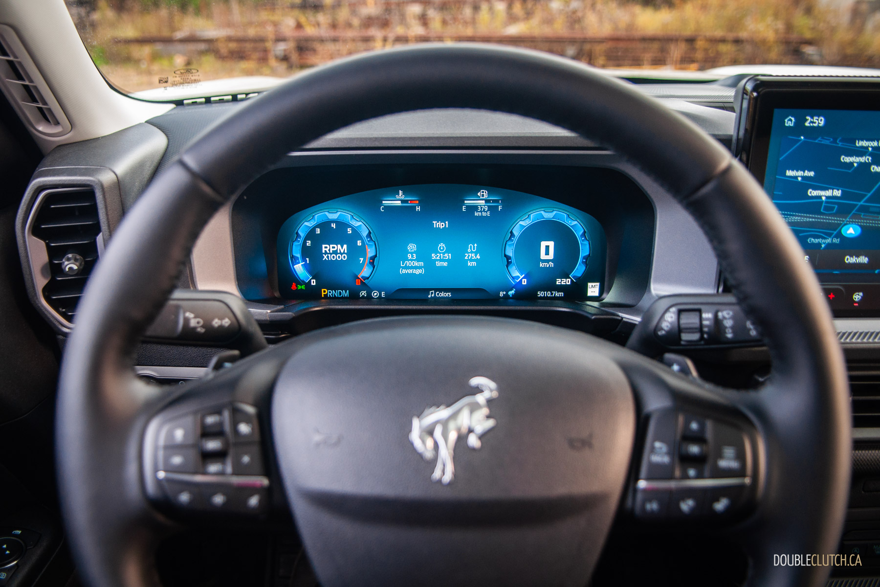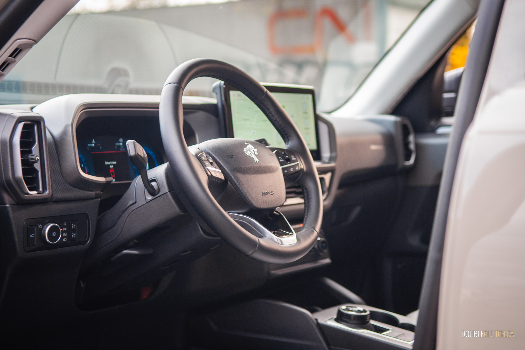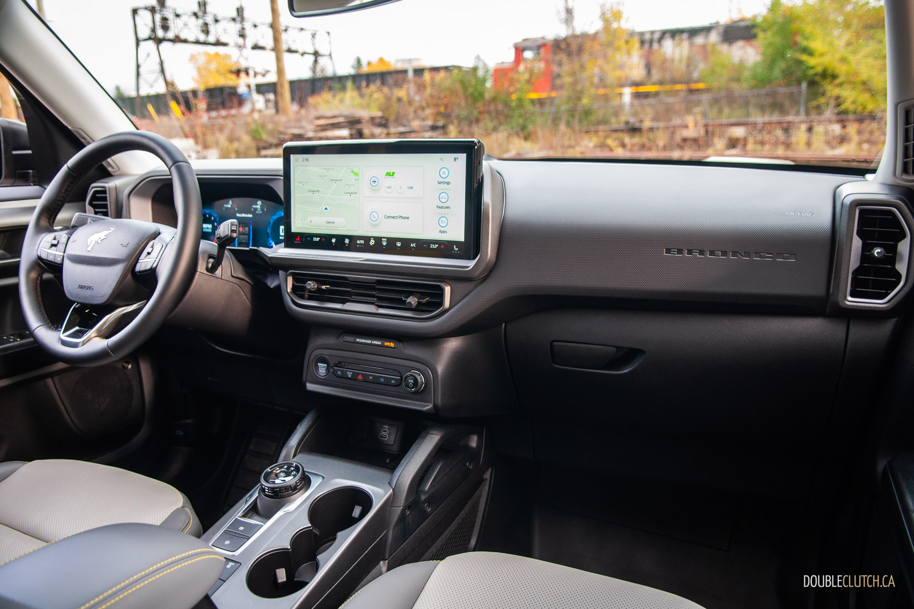 The Bronco Sport gets a mid-life refresh this year. Ford changed up the front and rear end a bit, gave the Bronco Sport some new wheel designs, made a bunch of previously optional safety tech now standard, and swapped out the screens you poke, prod, and stare at for larger units. The new 13.2-inch display protruding from the dash now includes the climate controls, but at least they stay on-screen all the time, and there’s still some physical switchgear down lower on the centre stack, thought the volume knob is a bit of a reach. Finally, a 12.3-inch display for the digital gauges replaces the part-digital, part-analog setup from before.