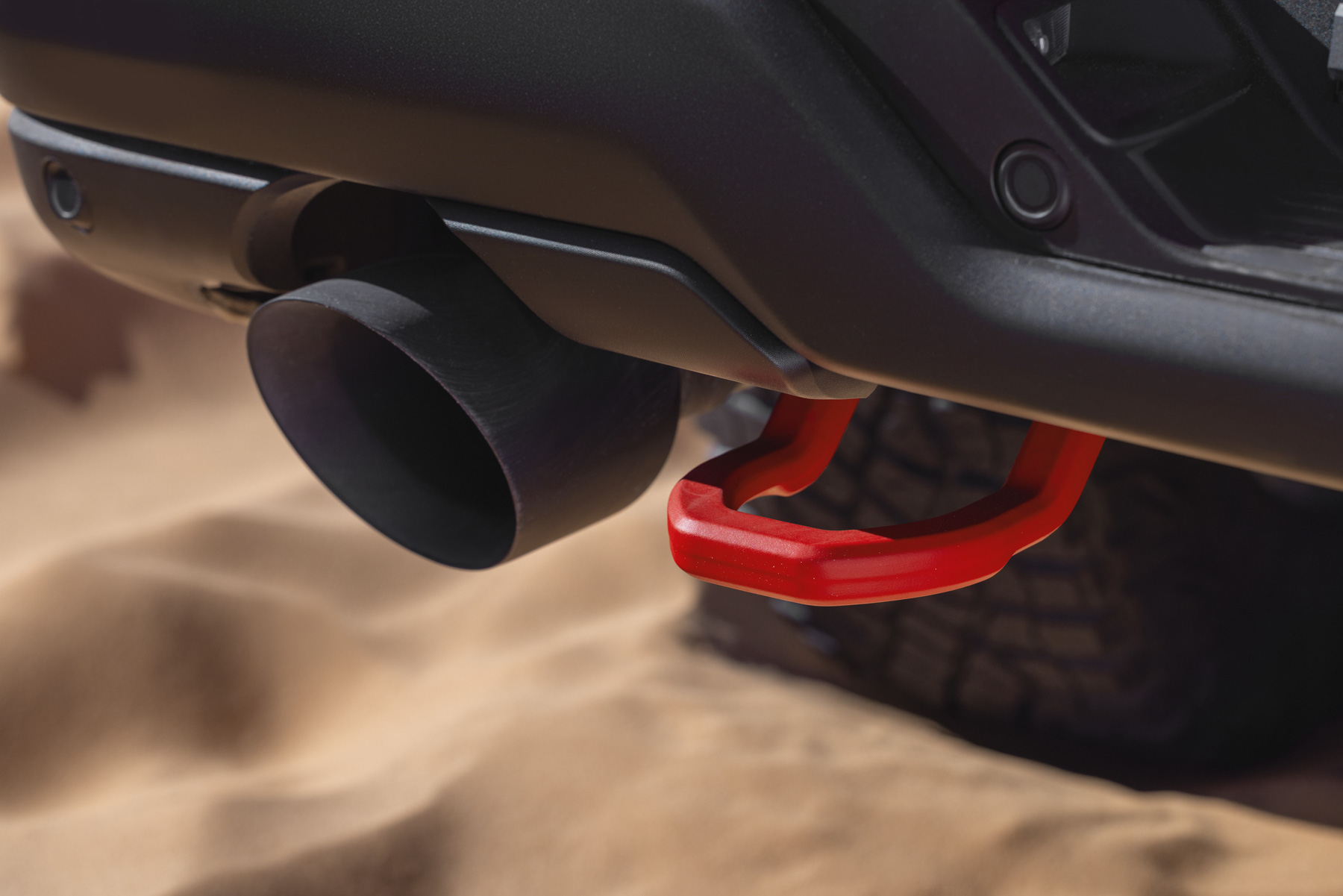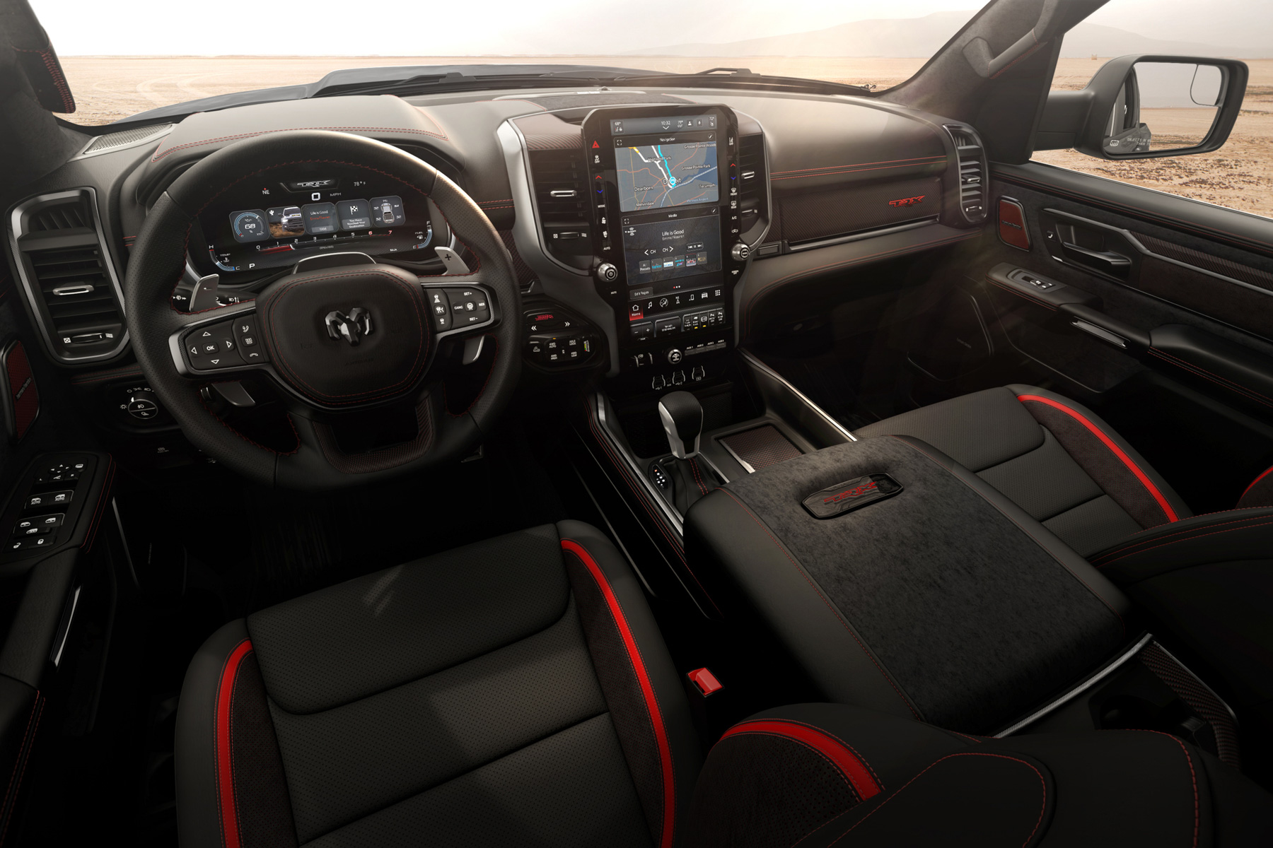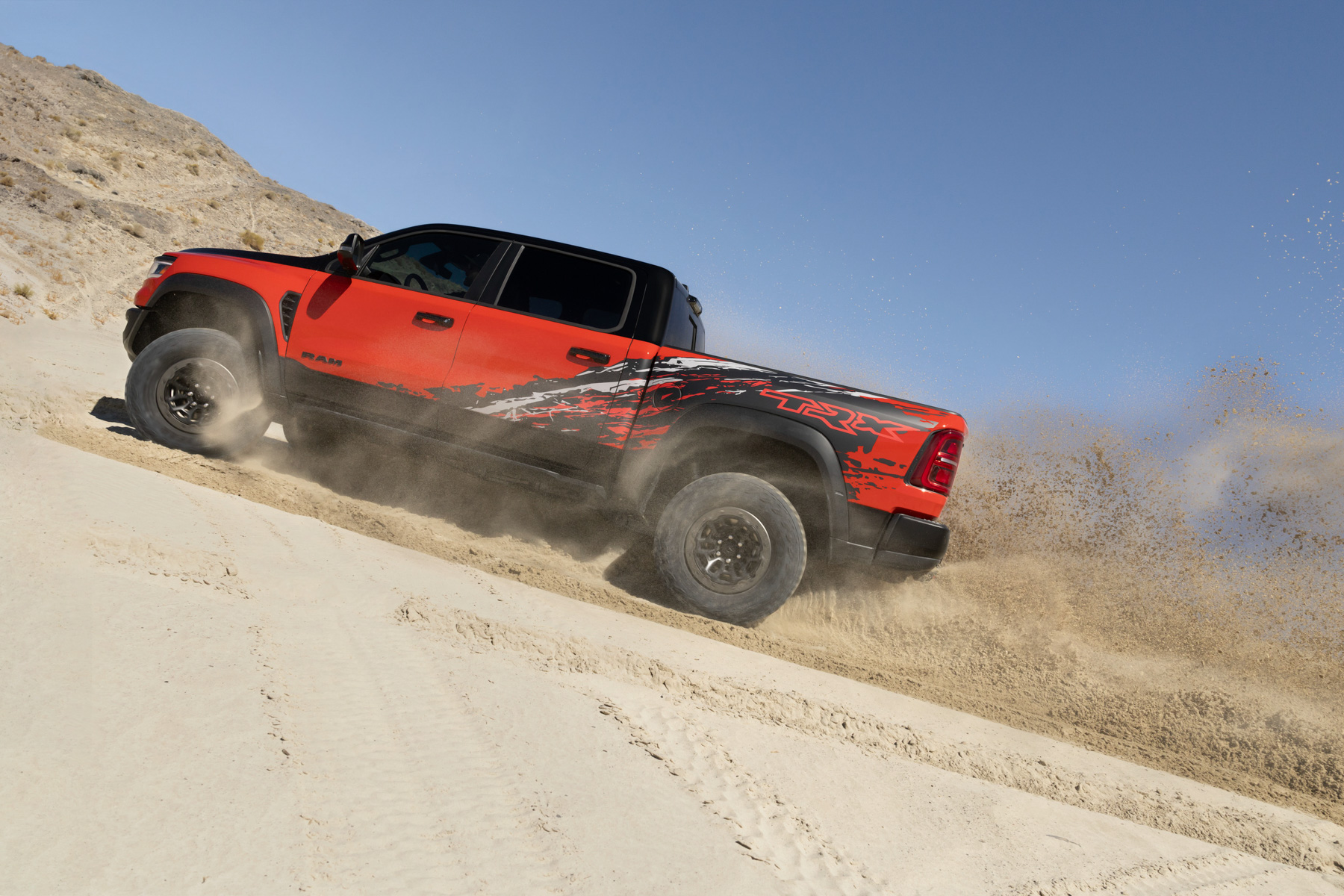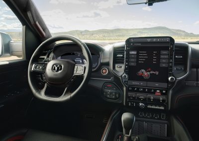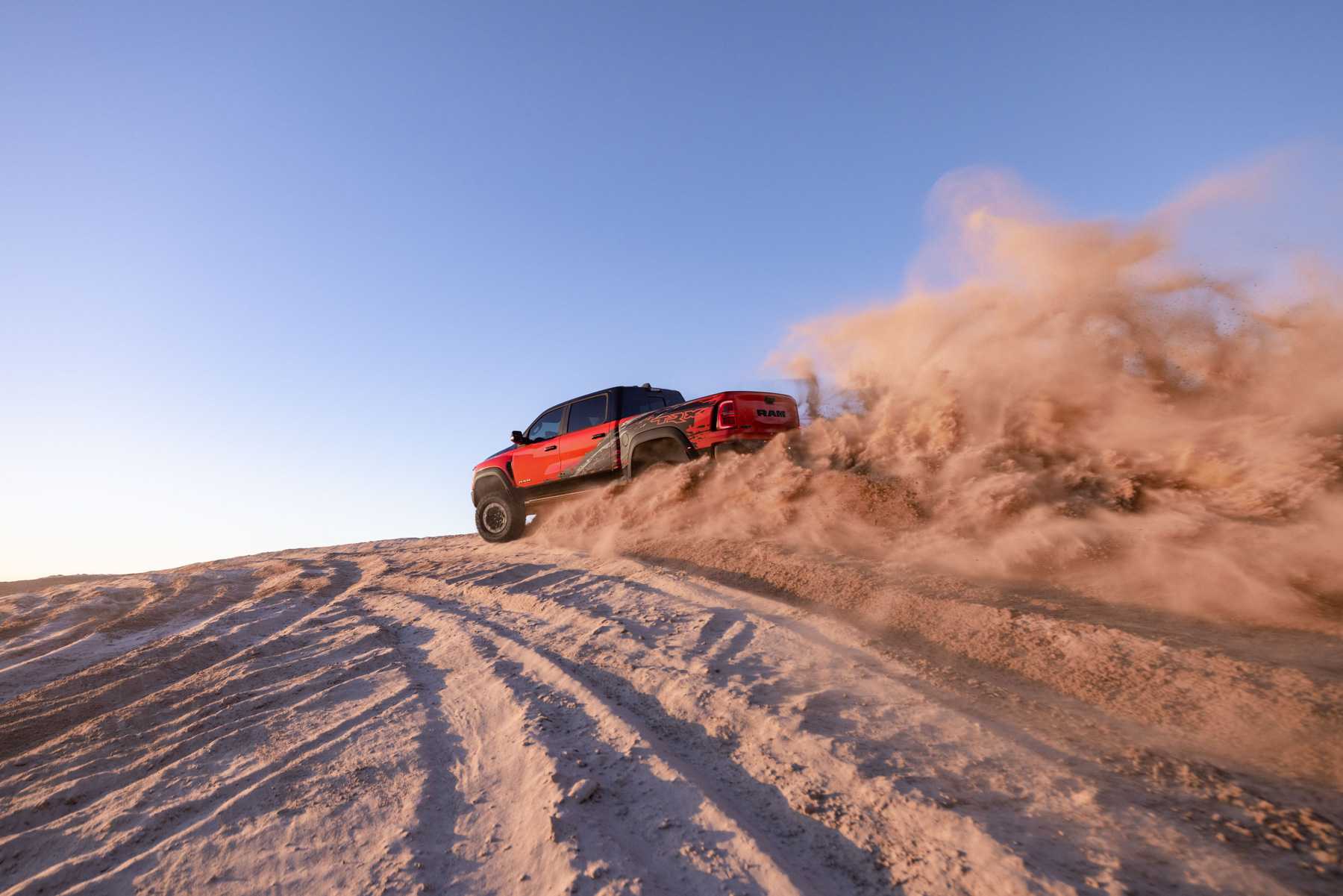 The supercharged Hemi is paired to an eight-speed automatic and Ram’s full-time selectable four-wheel-drive setup, with a TRX-specific 2.64:1 transfer case so you can guide this brute through tight spots with more precision. Also TRX-specific is the exhaust, natch, with an X-pipe and finished with two five-inch double-wall black tips. It sounds appropriately gnarly.