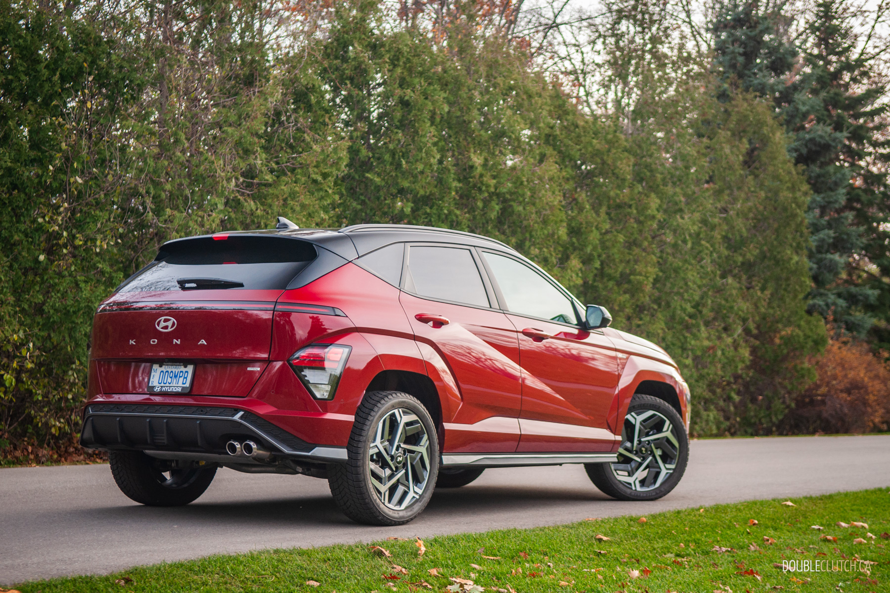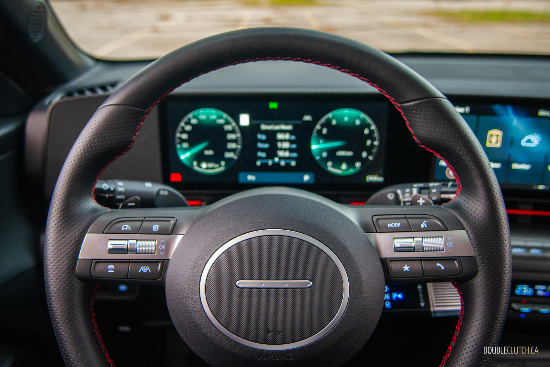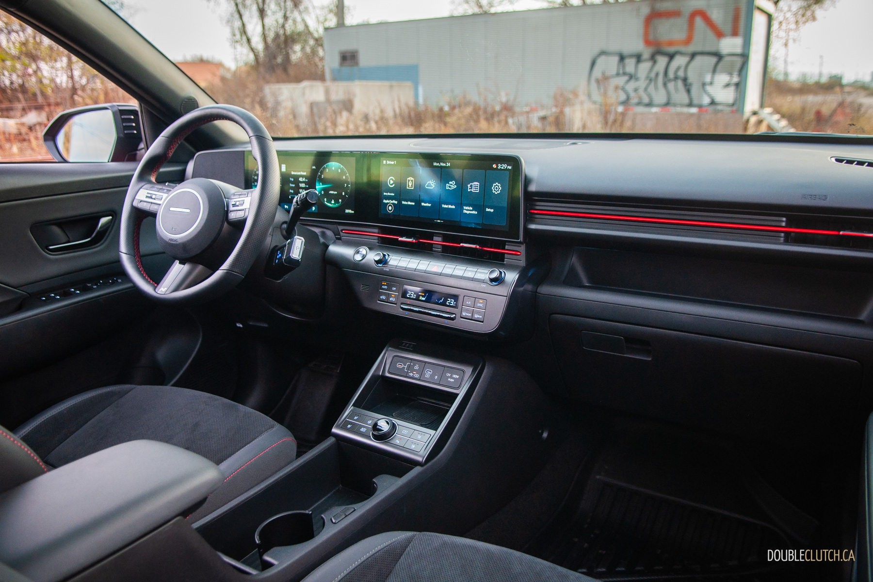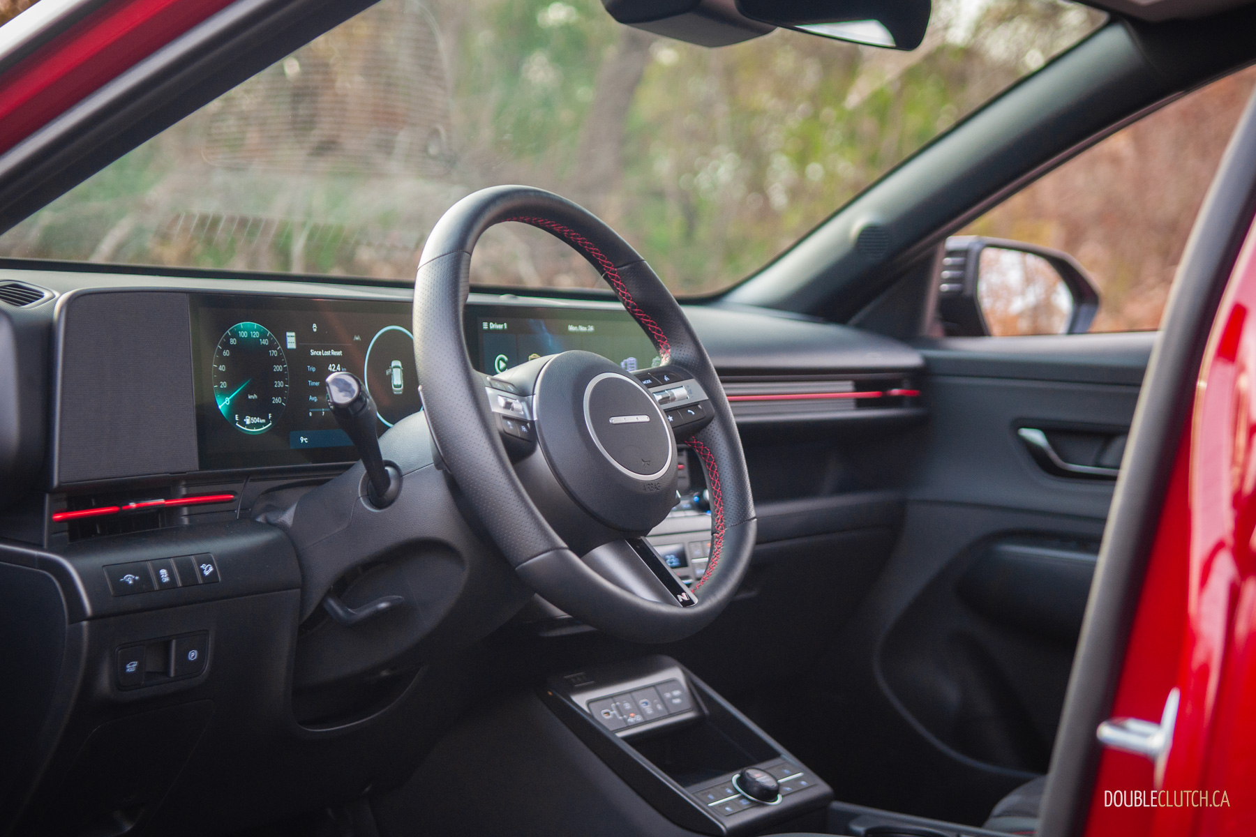 The rest of the 2026 Kona’s interior is mostly pleasant. There are quite a few hard touch-points, but everything feels solid and overall fit-and-finish is pretty good. Upper trims like our N-Line tester use twin 12.3-inch screens for the infotainment and gauge cluster under one glass panel; it’s all crisp, slick, and easy to use. Hyundai is usually great with ergonomics, and that’s mostly true with the Kona. The column-mounted shifter takes some getting used-to — twist-forward-for-drive and back-for-reverse makes sense in theory — but it opens up a lot of space on the centre console. The cubby between the seats can accomodate a small purse when you hide the cupholders, and further up, Hyundai still blesses the Kona with physical buttons and knobs. Praise be to the automotive gods, there’s even a tuning knob.