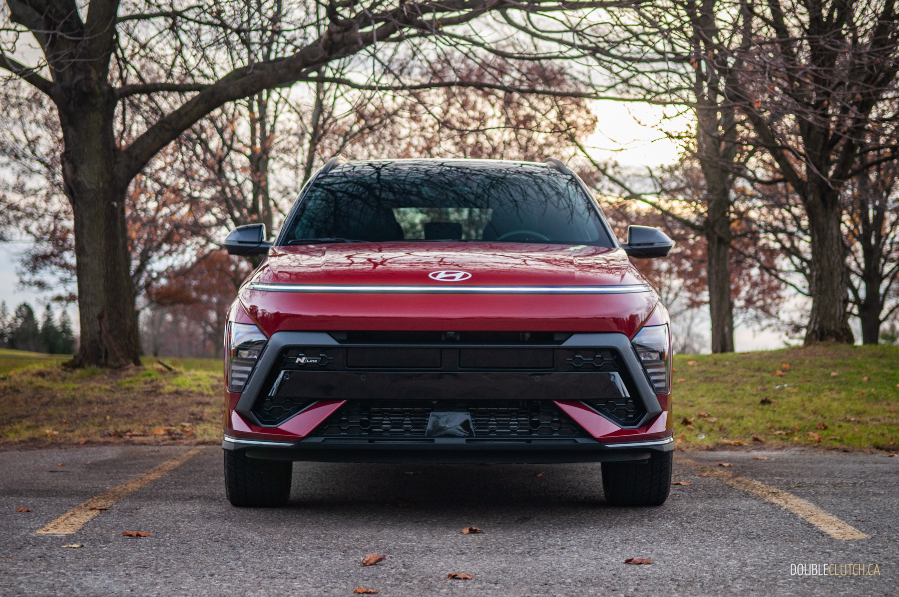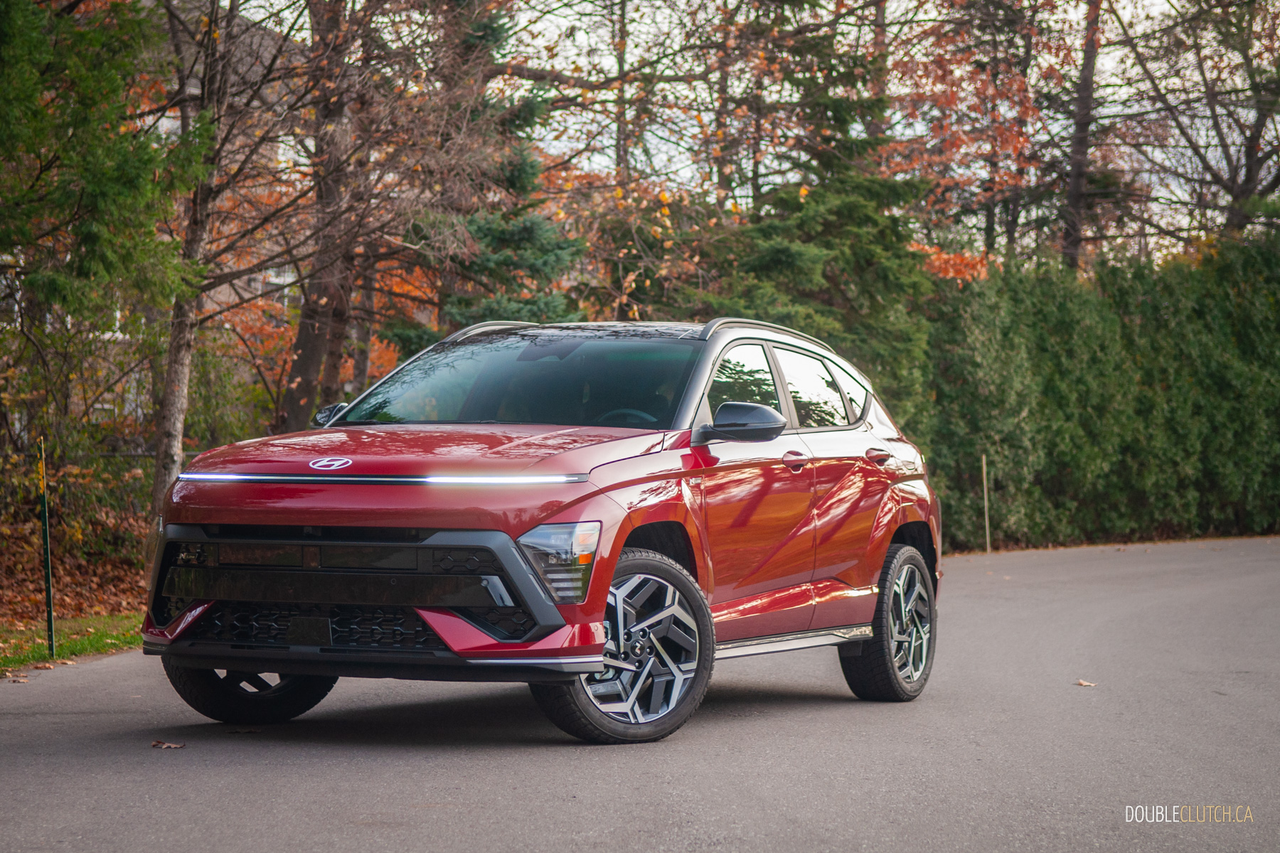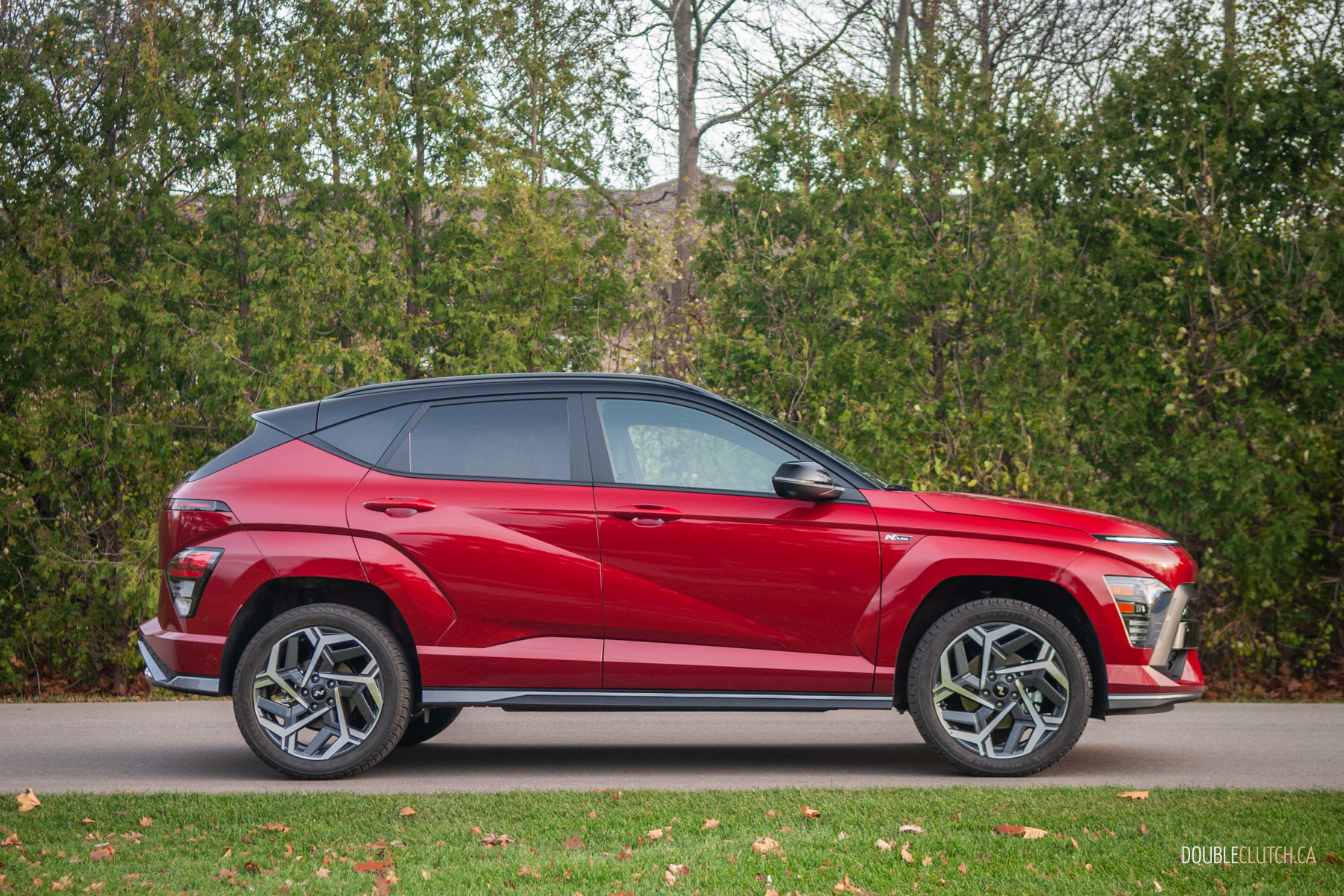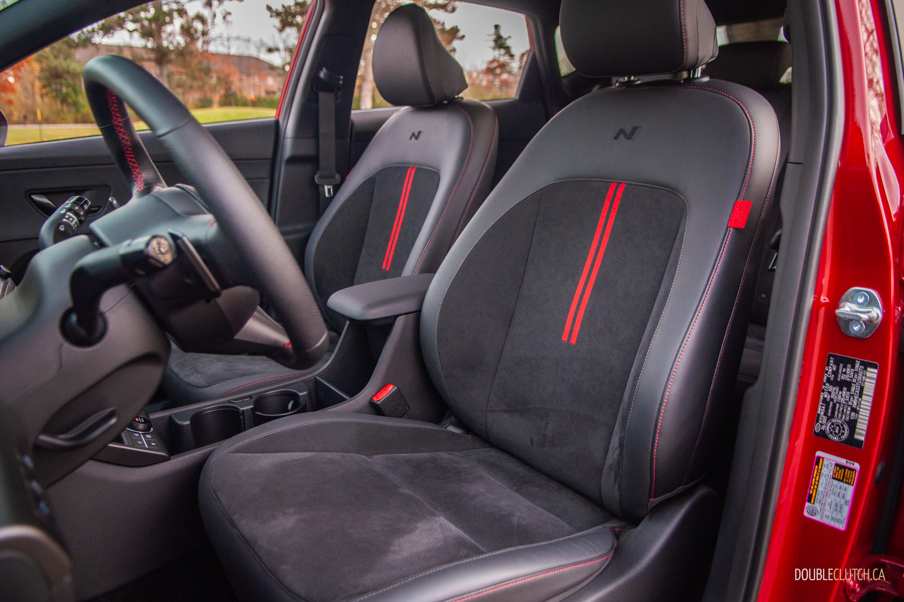 The rest of the 2026 Kona’s interior is mostly pleasant. There are quite a few hard touch-points, but everything feels solid and overall fit-and-finish is pretty good. Upper trims like our N-Line tester use twin 12.3-inch screens for the infotainment and gauge cluster under one glass panel; it’s all crisp, slick, and easy to use. Hyundai is usually great with ergonomics, and that’s mostly true with the Kona. The column-mounted shifter takes some getting used-to — twist-forward-for-drive and back-for-reverse makes sense in theory — but it opens up a lot of space on the centre console. The cubby between the seats can accomodate a small purse when you hide the cupholders, and further up, Hyundai still blesses the Kona with physical buttons and knobs. Praise be to the automotive gods, there’s even a tuning knob.