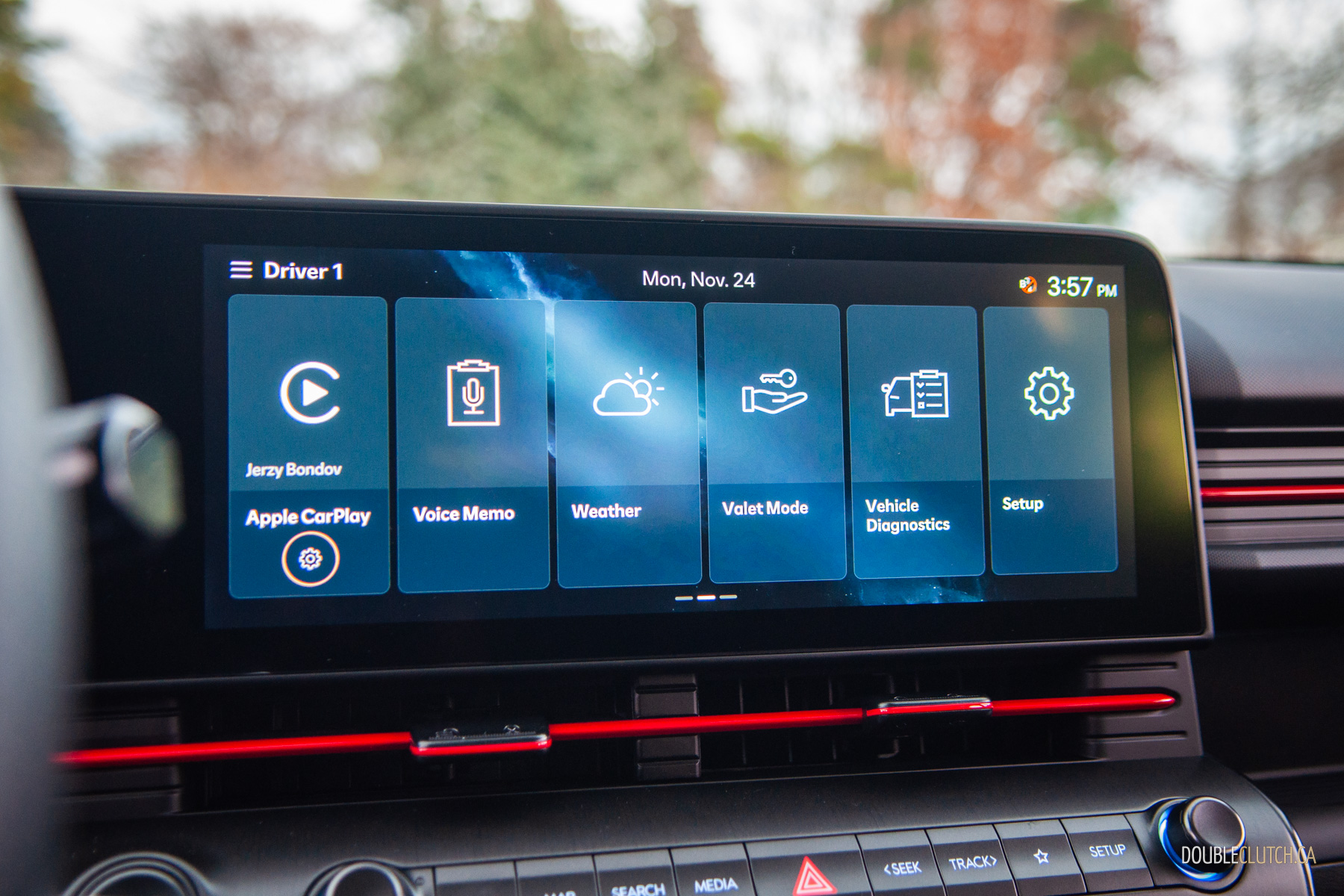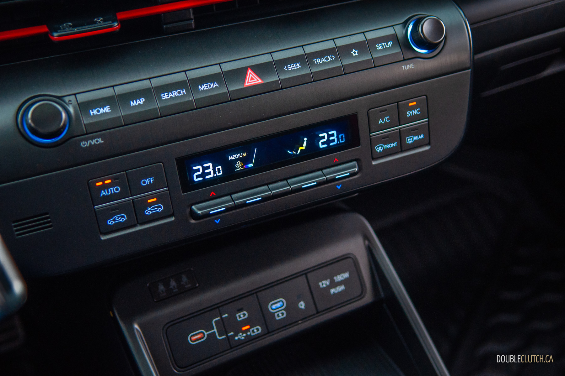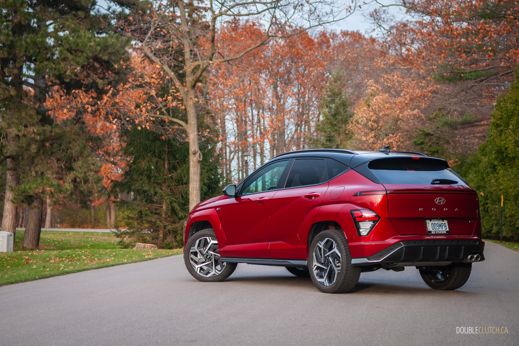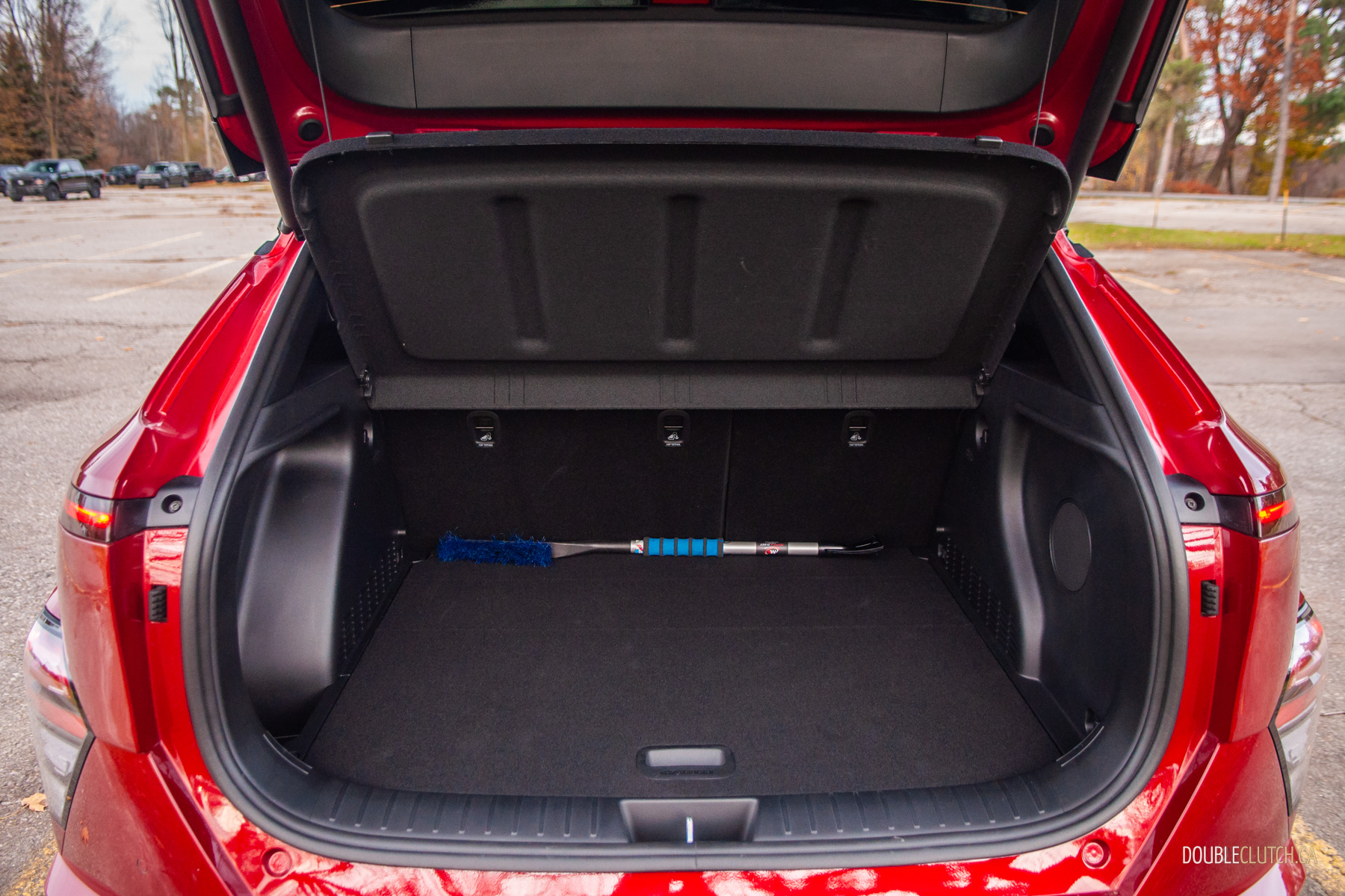 The rest of the 2026 Kona’s interior is mostly pleasant. There are quite a few hard touch-points, but everything feels solid and overall fit-and-finish is pretty good. Upper trims like our N-Line tester use twin 12.3-inch screens for the infotainment and gauge cluster under one glass panel; it’s all crisp, slick, and easy to use. Hyundai is usually great with ergonomics, and that’s mostly true with the Kona. The column-mounted shifter takes some getting used-to — twist-forward-for-drive and back-for-reverse makes sense in theory — but it opens up a lot of space on the centre console. The cubby between the seats can accomodate a small purse when you hide the cupholders, and further up, Hyundai still blesses the Kona with physical buttons and knobs. Praise be to the automotive gods, there’s even a tuning knob.