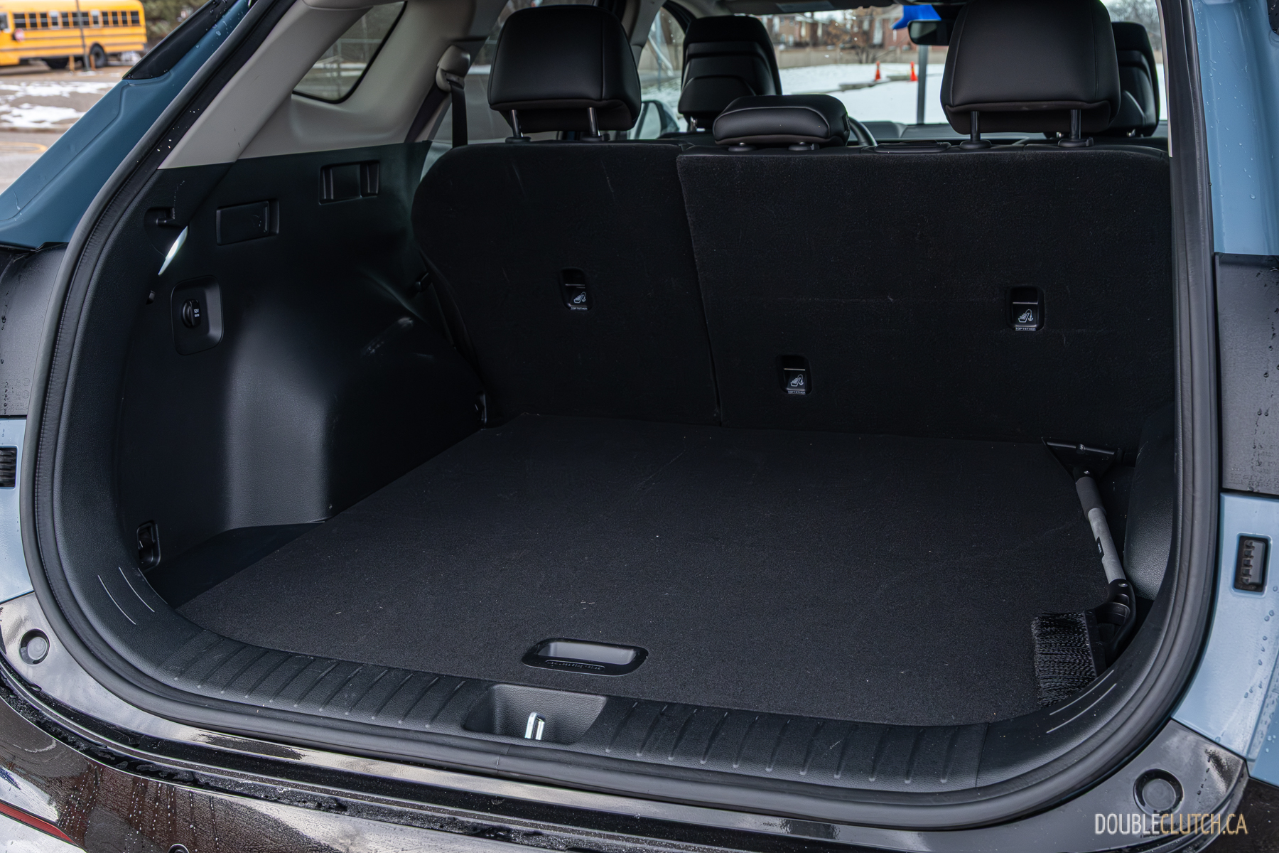 The (synthetic) leather feels perfectly acceptable, spruced up nicely with a patterned stitch and a contrasting suede-like material across the top side of the seats, which are both heated and cooled up front (and heated in the back). There’s perhaps a bit too much black throughout the cabin, and only a small ambient lighting strip across the dash to brighten things up a touch. The centre console is finished with patterned dark grey trim, which looks nice but doesn’t do much to brighten up the otherwise dark interior. That being said, if the black bothers you so much, Kia offers an optional red leather interior. Passenger space overall is neck-in-neck with major players like the CR-V and RAV4, although it lags slightly in cargo space if you’re really counting.