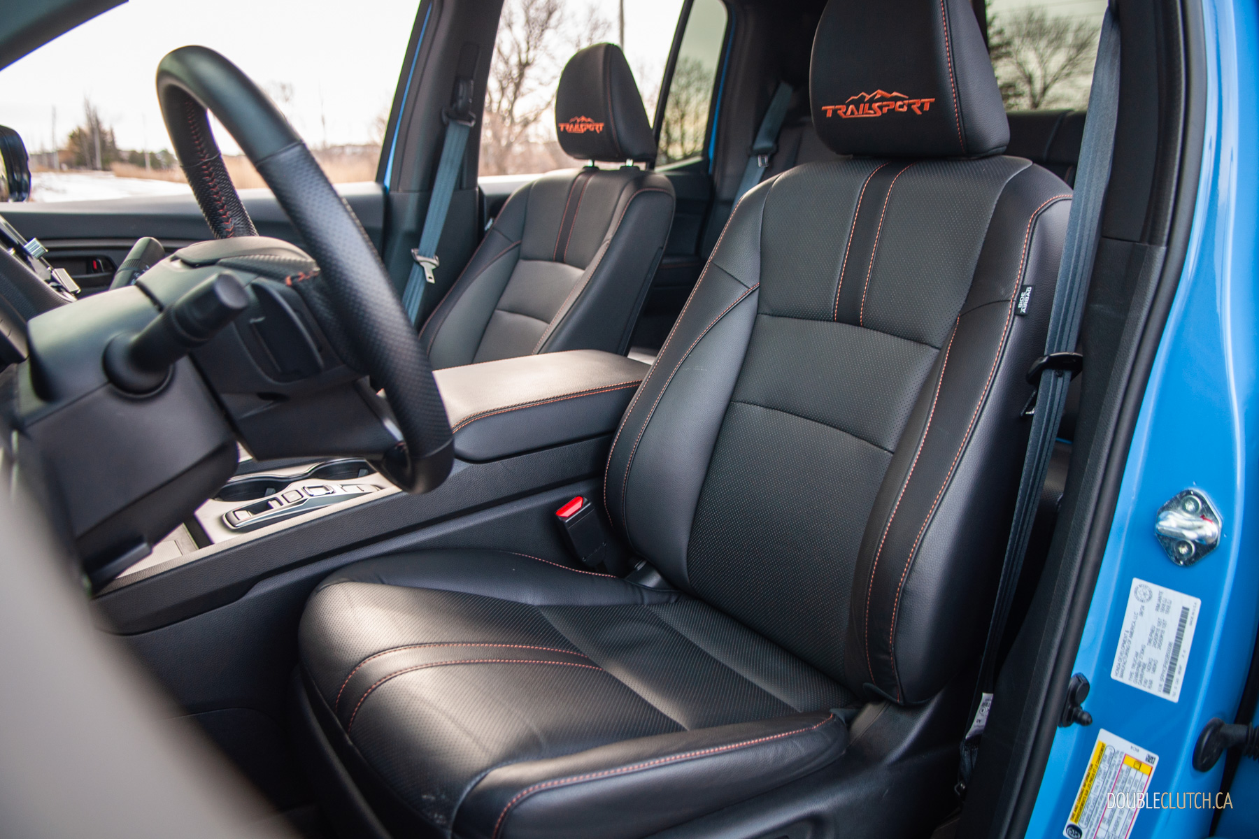 Our tester was the TrailSport trim, which is positioned as the lineup’s more adventure-oriented model. This trim adds all-terrain tires on 18-inch Shark Grey wheels, leather upholstery with orange stitching, additional underbody protection, and slightly retuned suspension. While these upgrades add some visual flair and light-duty capability, don’t expect the TrailSport to suddenly transform the Ridgeline into a hardcore off-roader. Towing capacity tops out at 5,000 pounds, which is respectable but falls short of competitors like the Ford Ranger and Chevrolet Colorado, both of which can tow up to 7,500 pounds when properly equipped.
