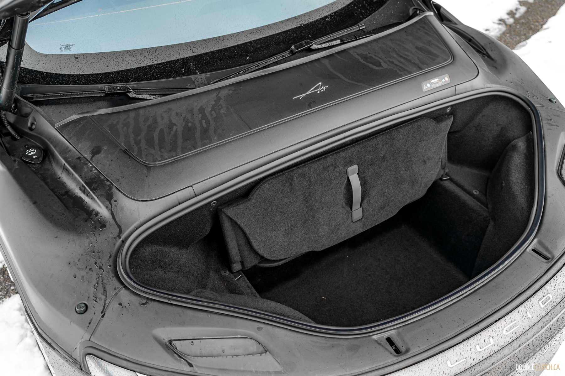 Even something as innocuous as the washer fluid filler location; it’s nestled in a channel under the frunk where any spillage will run along to the ground without making a mess of anything else. Said frunk is also enormous, has two tiers, and has a very convenient (and quick!) powered opening, but an easy manual closing – which is nice, because manually closing a powered door sucks. Similarly, the powered charge door slides on a clever mechanism and is super slick, too; something other car companies really struggle with.