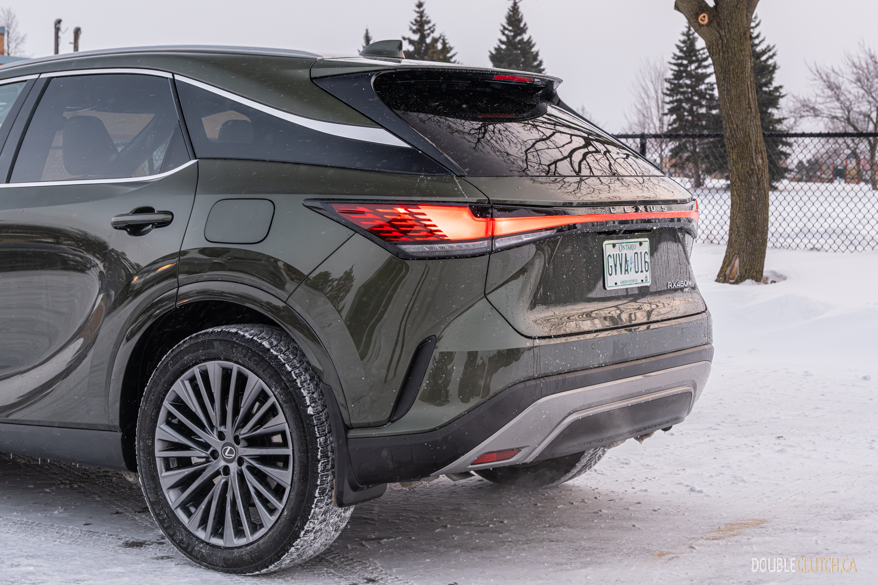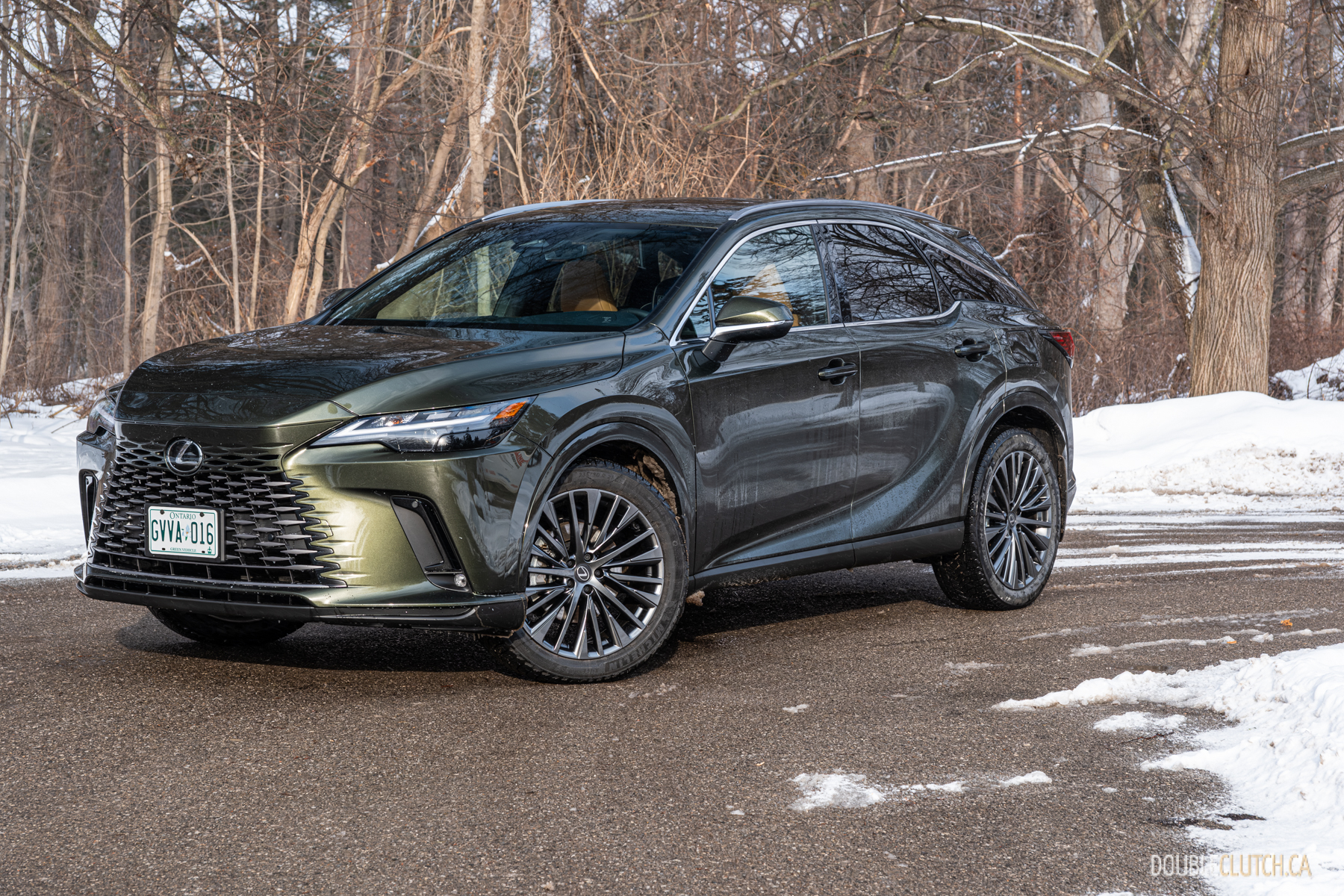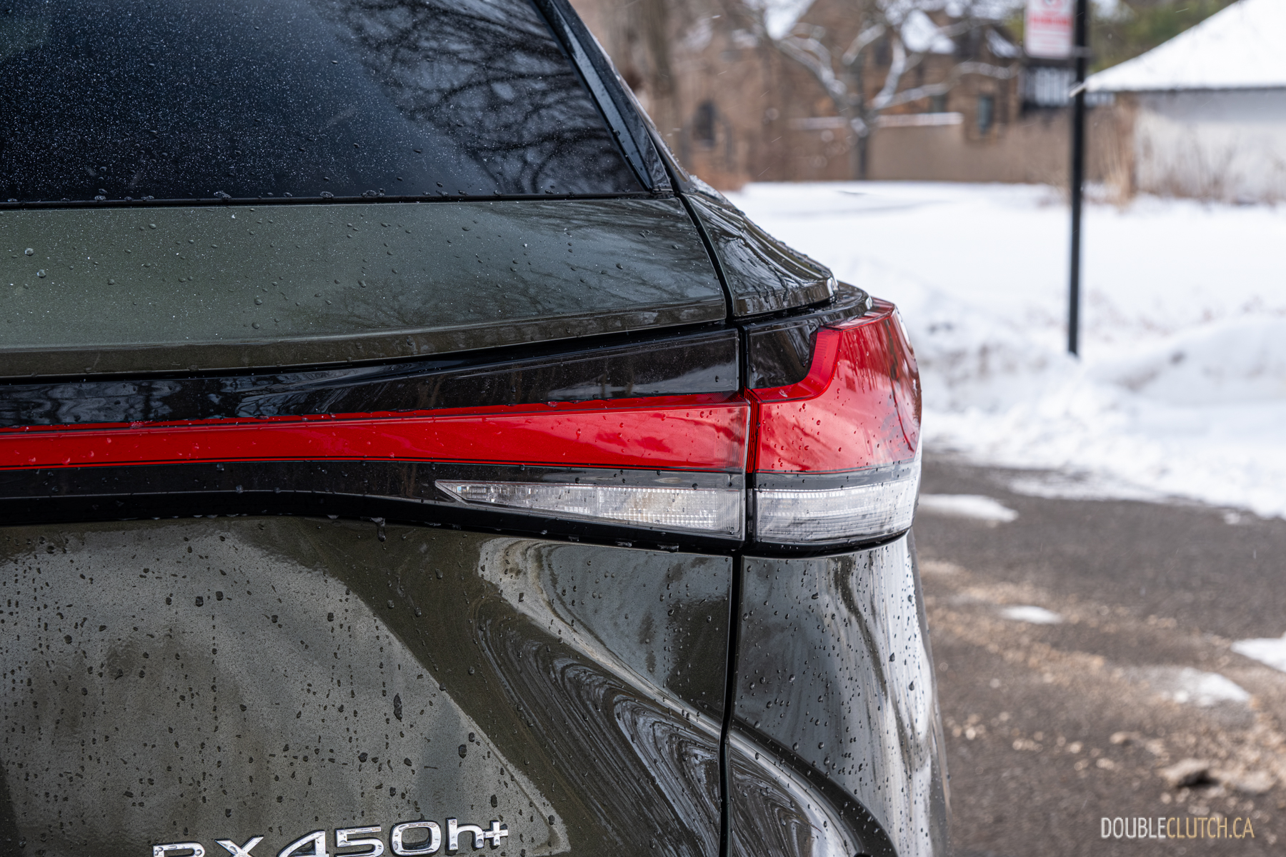First impressions are everything. This RX tester made a good one, finished in Lexus’ lovely Nori Green Pearl paint against a caramel leather interior. Maybe not Lexus classic, but green-on-tan is oh-so-perfect and reminds me of old money British luxury in all the best ways. The RX is styled aggressively, with Lexus’ large spindle grille and razor sharp headlights dominating the front end. Sharp character lines along the side remind me of origami, and the 21-inch gunmetal wheels look sharp. The rear end has a sloping, almost coupe-SUV-like profile with a small spoiler sitting atop, and a light bar connecting the tail lights. There are no exhaust tips to speak of; Lexus finishes off the RX’s rear end with a satin silver lower bumper applique for some added visual drama. It looks athletic, premium, and unmistakably modern Lexus. I’m (still) a fan.