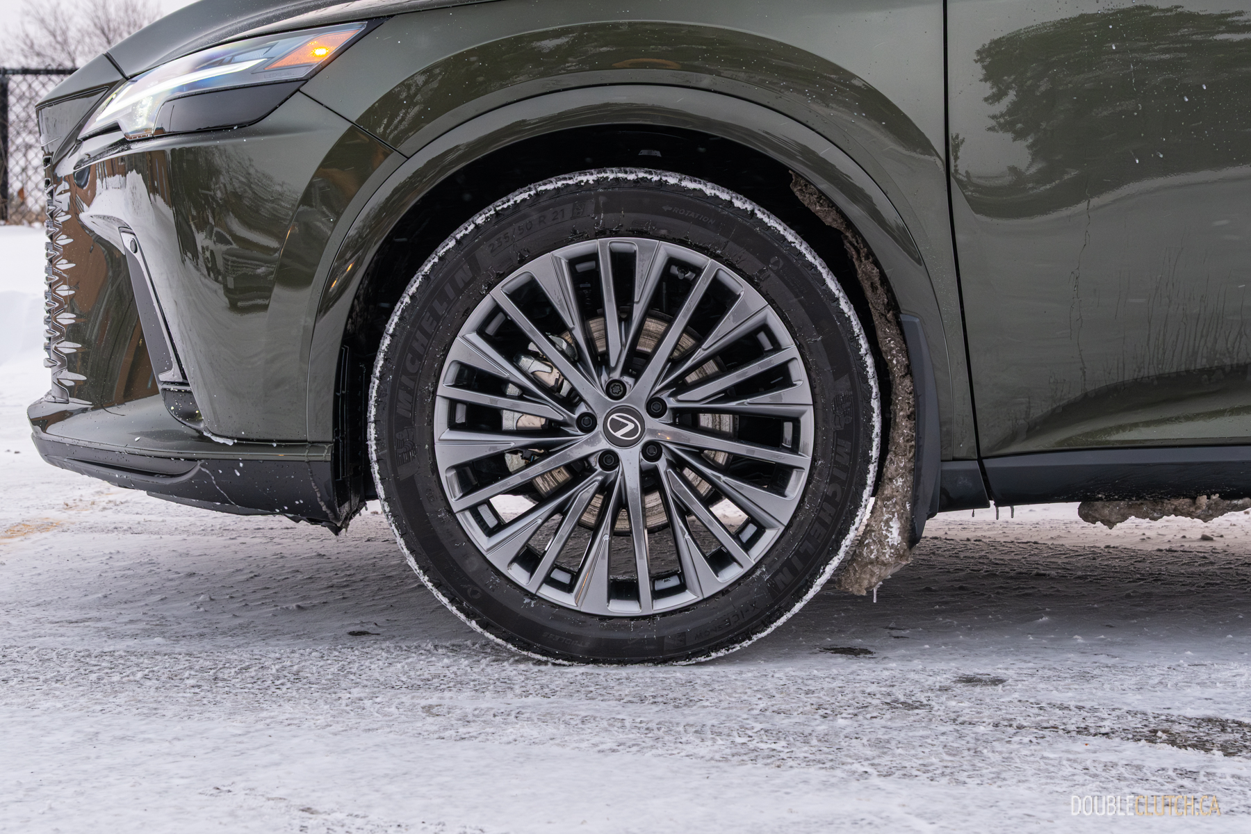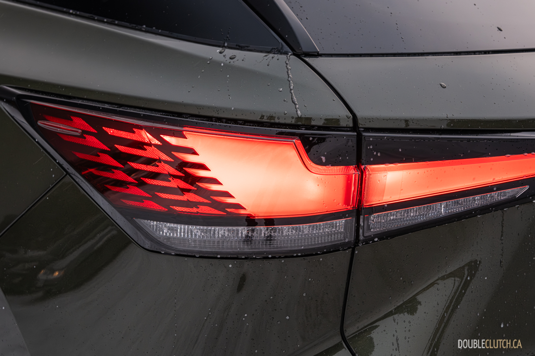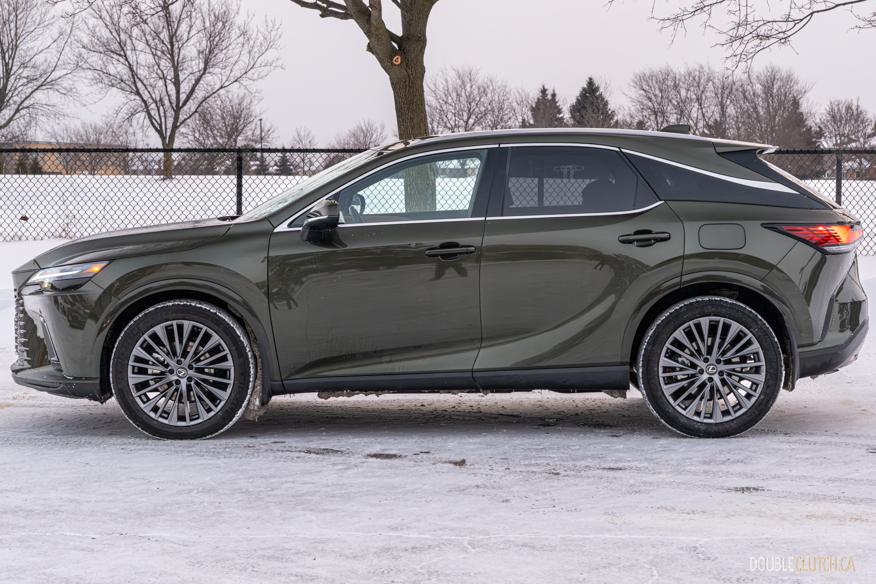 First impressions are everything. This RX tester made a good one, finished in Lexus’ lovely Nori Green Pearl paint against a caramel leather interior. Maybe not Lexus classic, but green-on-tan is oh-so-perfect and reminds me of old money British luxury in all the best ways. The RX is styled aggressively, with Lexus’ large spindle grille and razor sharp headlights dominating the front end. Sharp character lines along the side remind me of origami, and the 21-inch gunmetal wheels look sharp. The rear end has a sloping, almost coupe-SUV-like profile with a small spoiler sitting atop, and a light bar connecting the tail lights. There are no exhaust tips to speak of; Lexus finishes off the RX’s rear end with a satin silver lower bumper applique for some added visual drama. It looks athletic, premium, and unmistakably modern Lexus. I’m (still) a fan.