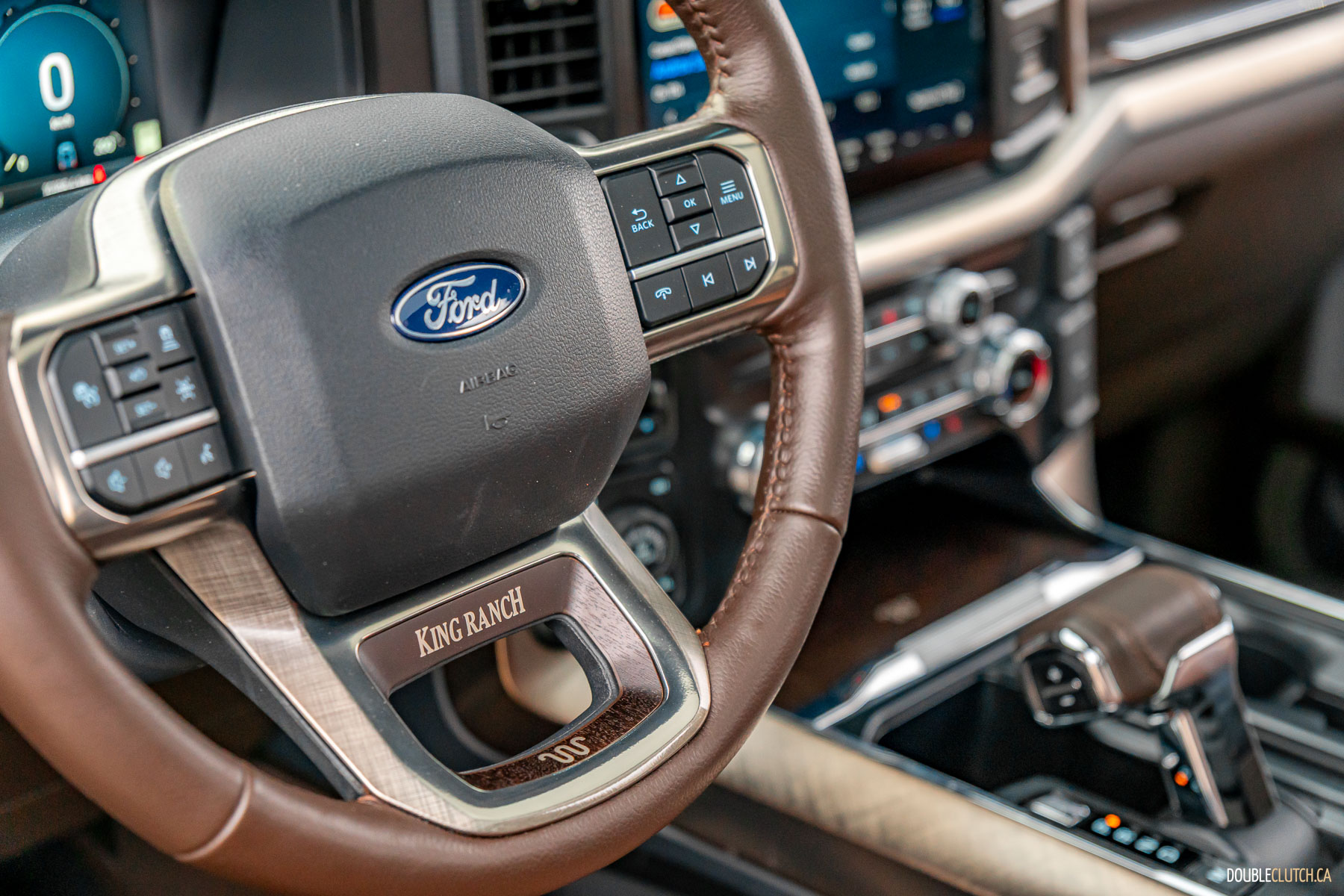 This continues inside, where the King Ranch is adorned with Java two-tone brown leathers, with contrasting French stitching. Dark wood accents with subtle inlays, brushed brass and satin-nickel continue the trend of lending warmth and charm to the F-150. It is remarkably well executed, with quality materials, good fit/finish, and impressive attention to detail. Style is a matter of taste, but I prefer this over the Platinum’s cabin every time – and I’ll add there’s quite a bit more effort on display here than the new Expedition King Ranch.