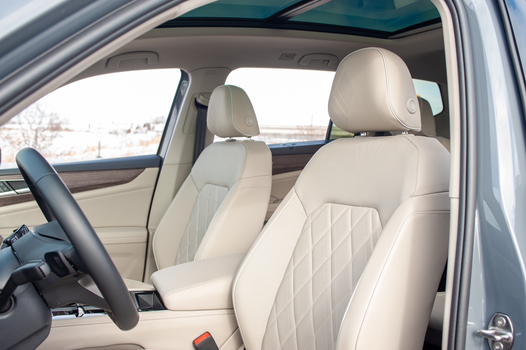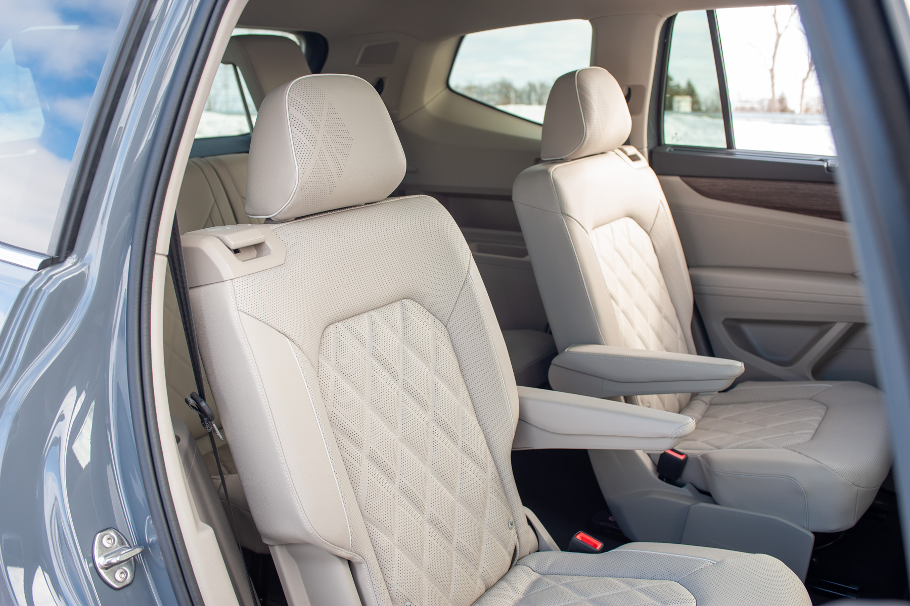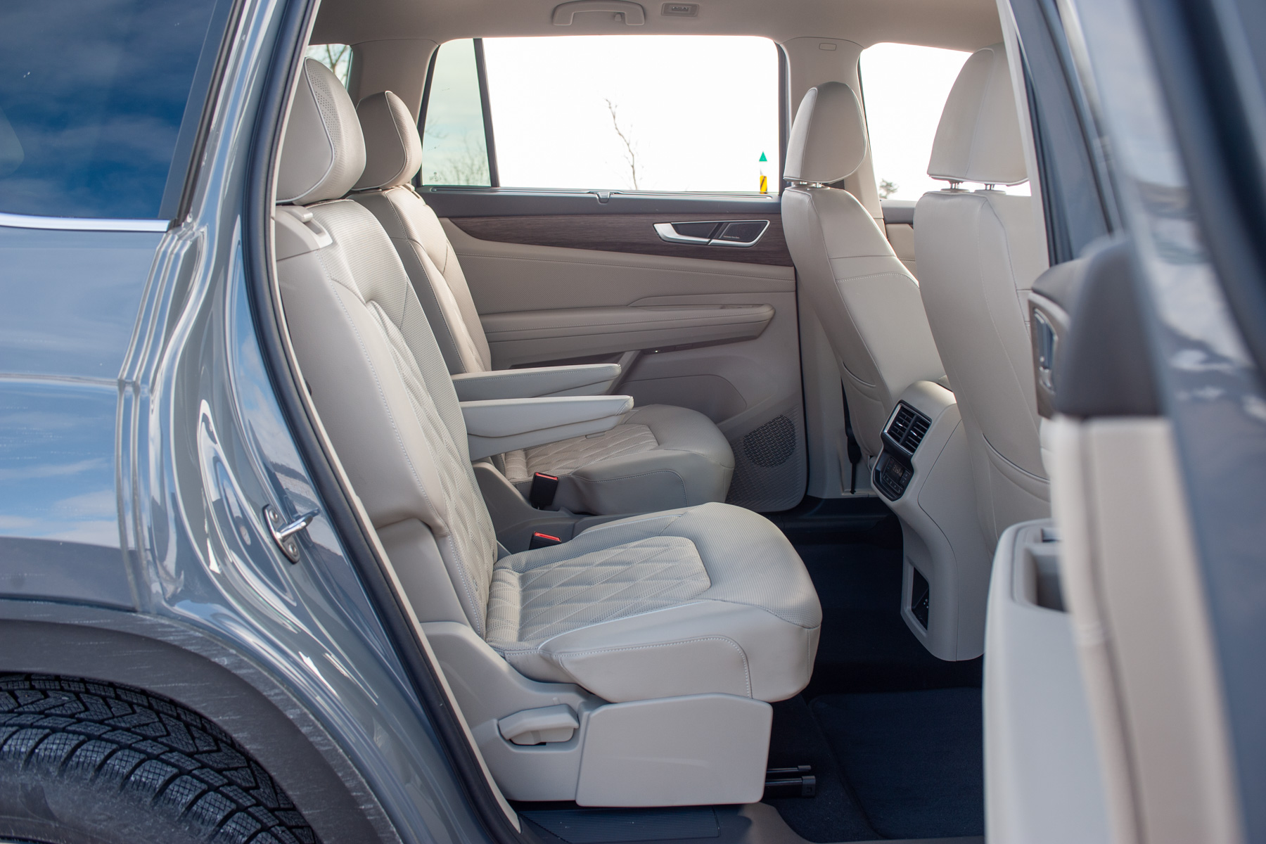 Stepping into the Atlas, you immediately notice the emphasis on comfort and space. The Execline trim introduces slightly nicer materials throughout, like soft-touch surfaces on the upper dash and upper section of the door cards, leather upholstery with quilted inserts, and an overall more upscale aesthetic compared to lesser trims. The driver’s seat itself is very comfortable and adjustable enough to accommodate a range of body types and heights, making for a less stressful driving experience despite the Atlas’ size. The visibility from the cabin is really good thanks to the big greenhouse, a valuable trait when navigating tight city streets or congested parking lots.