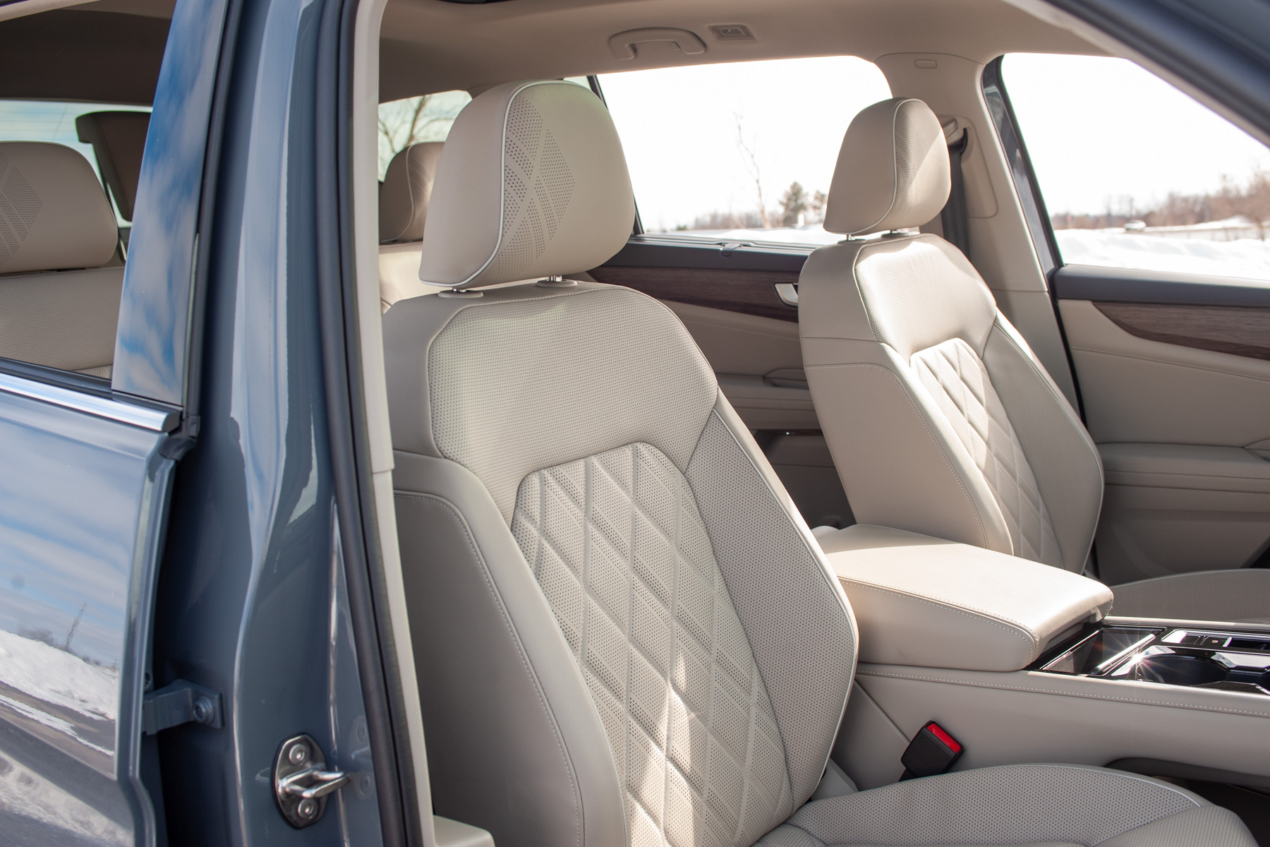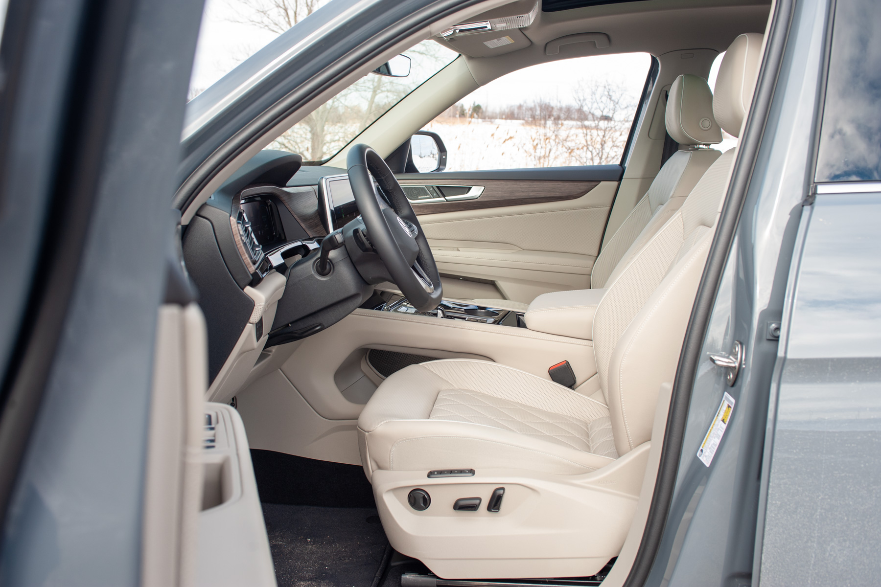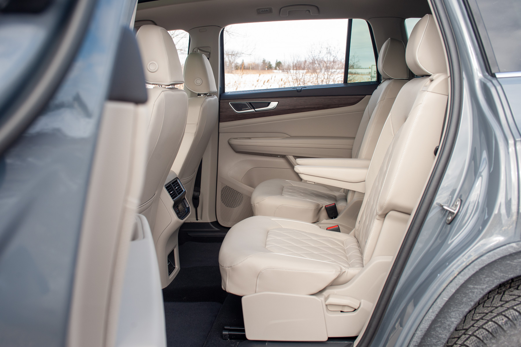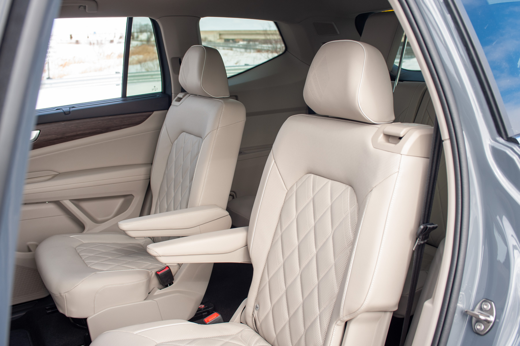 Stepping into the Atlas, you immediately notice the emphasis on comfort and space. The Execline trim introduces slightly nicer materials throughout, like soft-touch surfaces on the upper dash and upper section of the door cards, leather upholstery with quilted inserts, and an overall more upscale aesthetic compared to lesser trims. The driver’s seat itself is very comfortable and adjustable enough to accommodate a range of body types and heights, making for a less stressful driving experience despite the Atlas’ size. The visibility from the cabin is really good thanks to the big greenhouse, a valuable trait when navigating tight city streets or congested parking lots.